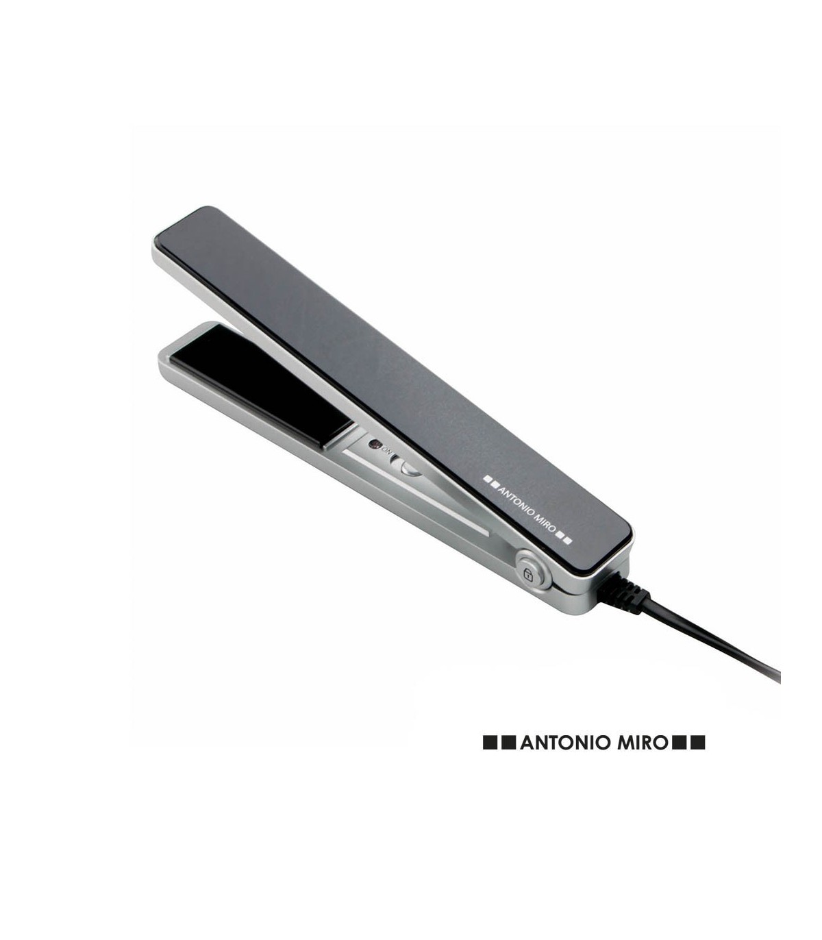 Plancha para pelo de Antonio Miró de sobrio diseño. Con recubrimiento cerámico en paletas CA 220-240V para regalos promocionales.