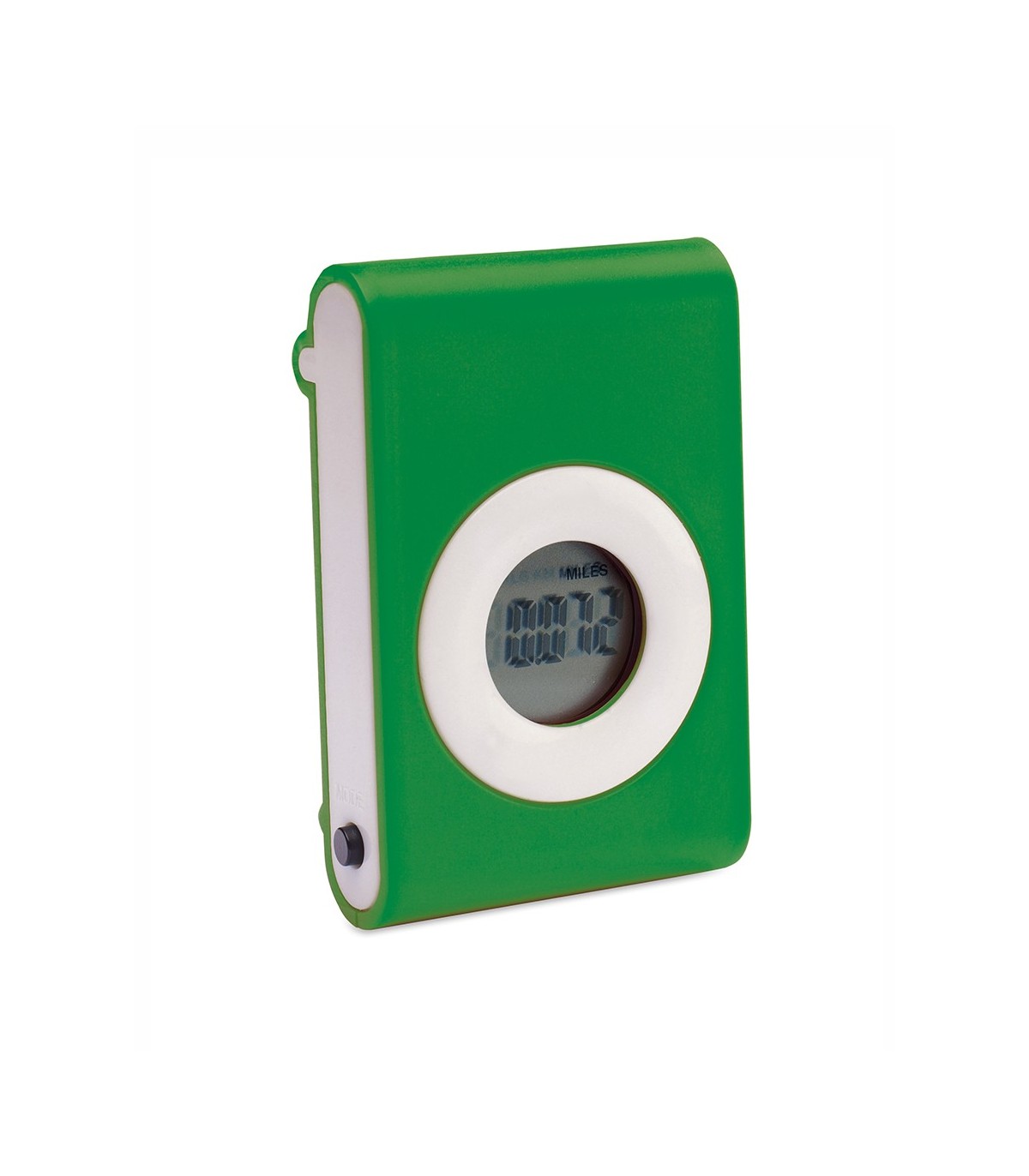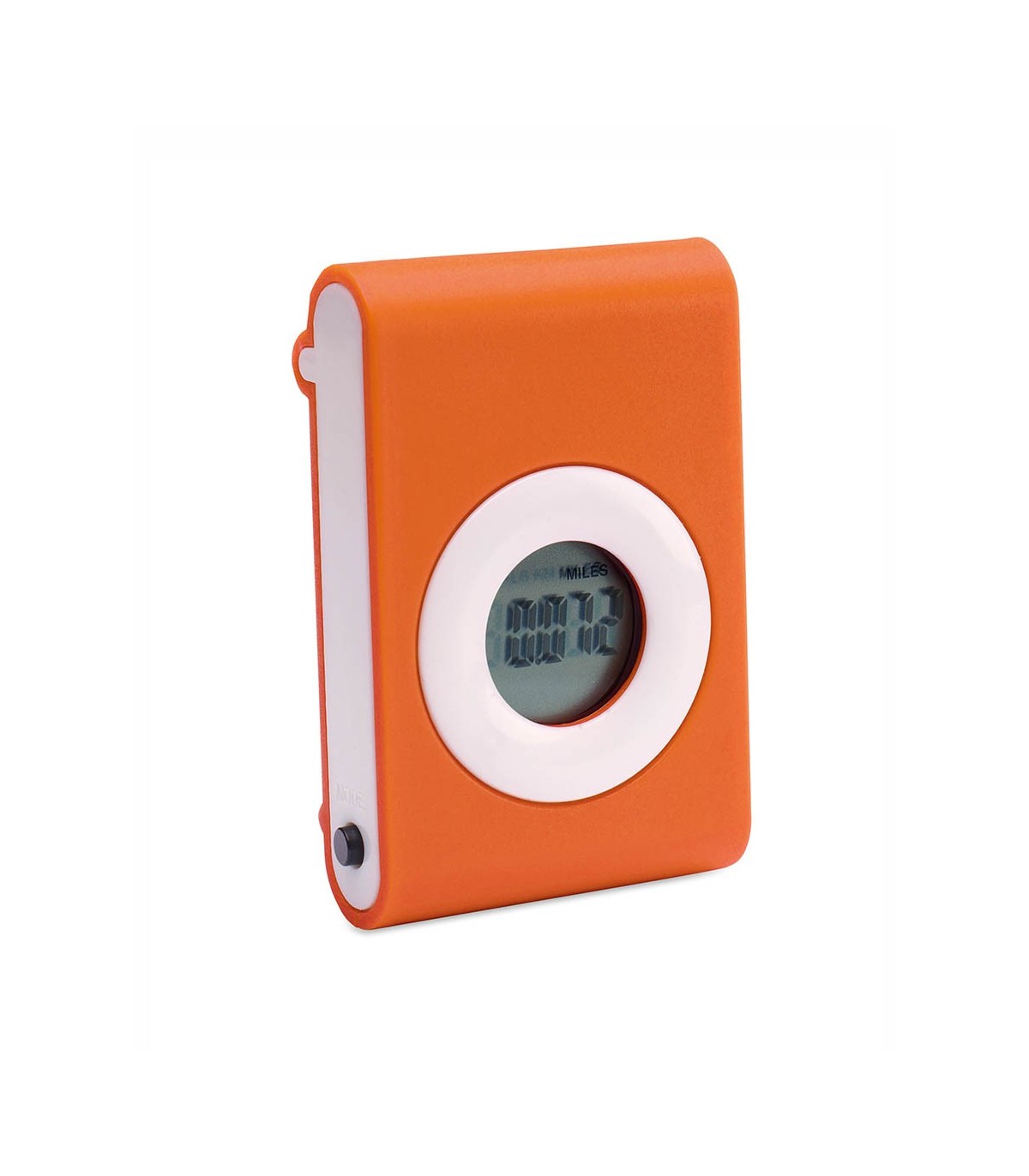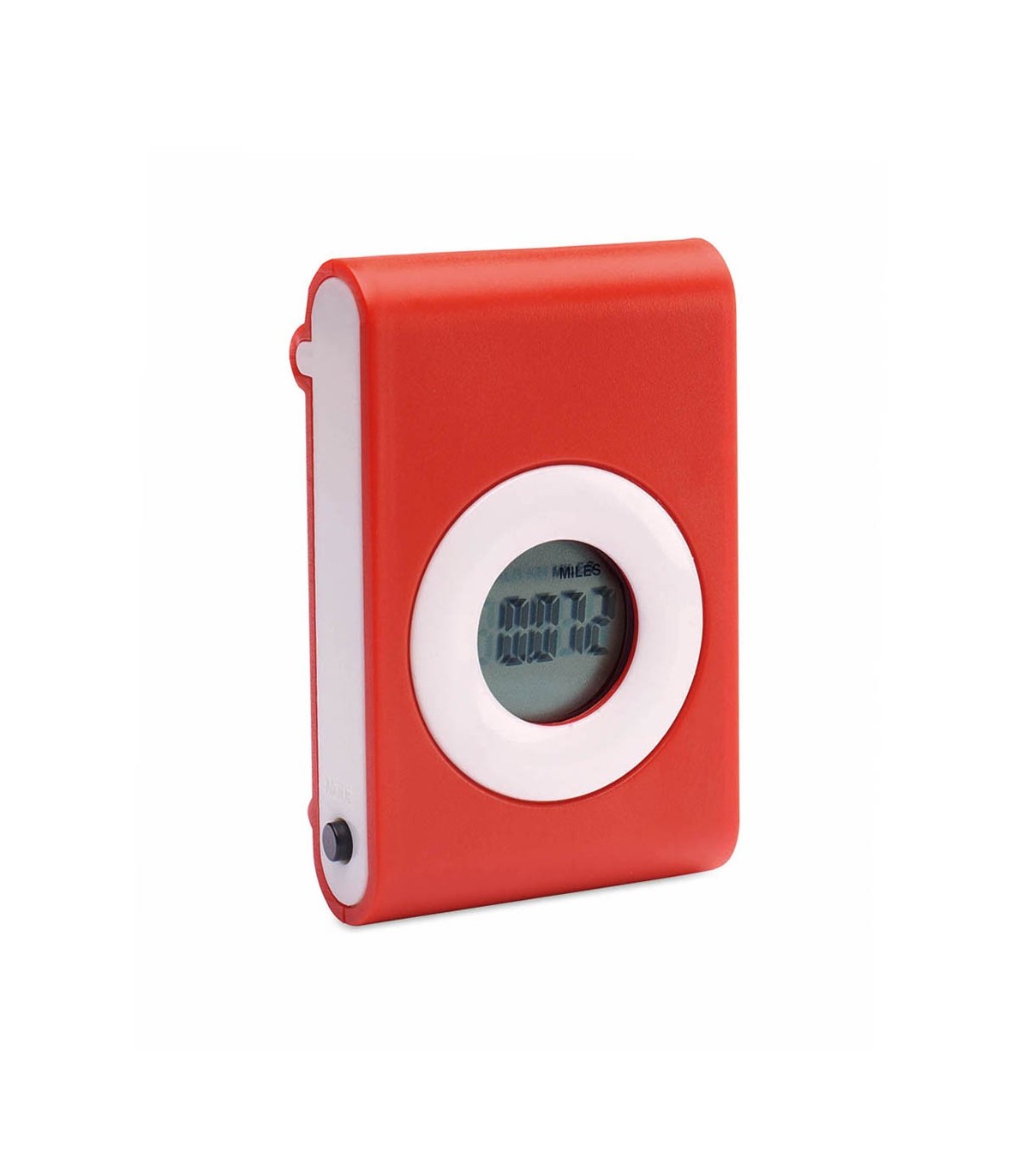 Práctico podómetro contador e pasos en original diseño bicolor con suave cuerpo en vivos tonos y pinza de fijación. Configurable con funciones: pasos, distancia recorrida y calorías consumidas. Pila de botón incluida con film protector y presentado en caja individual.