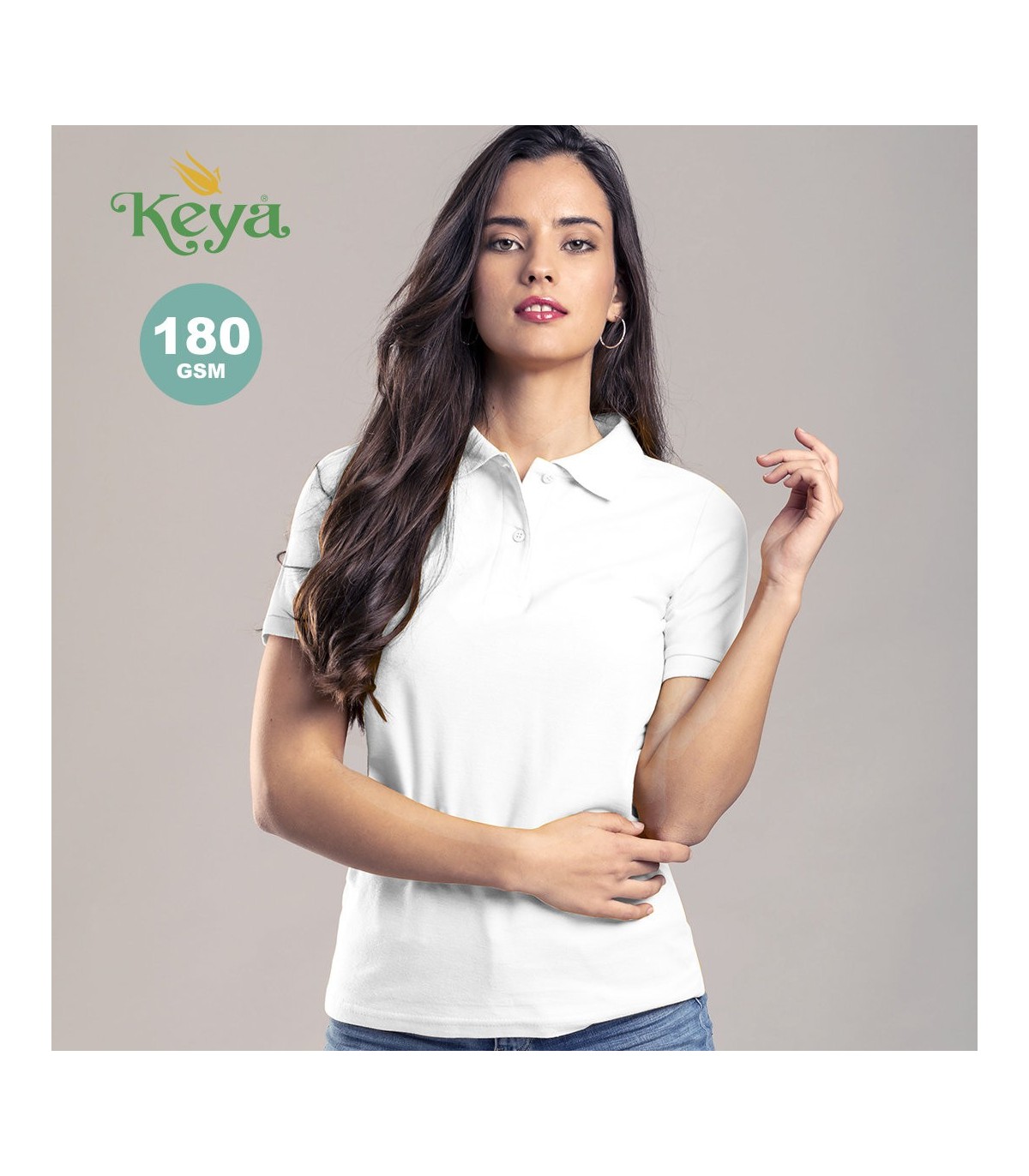 Polo de piqué para mujer de Keya WPS180. En material 100% algodón de 180g/m². Con dos botones de cierre a juego y disponible en color blanco. Tallas S, M, L, XL, XXL.