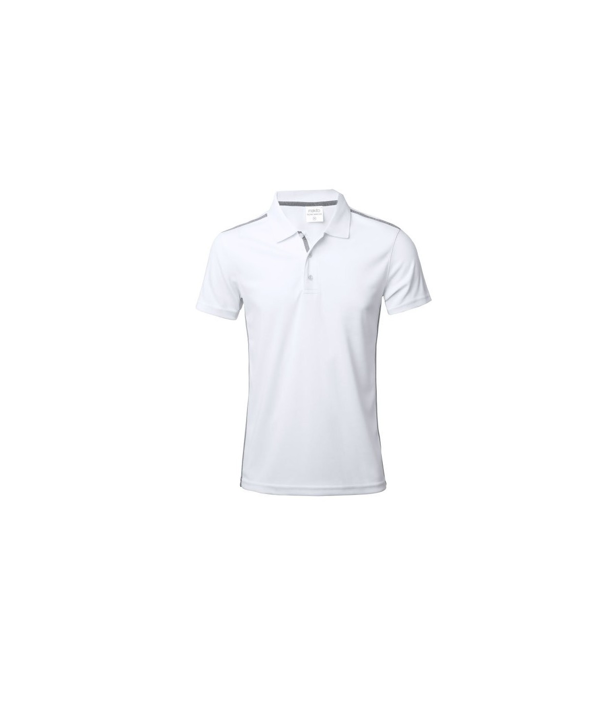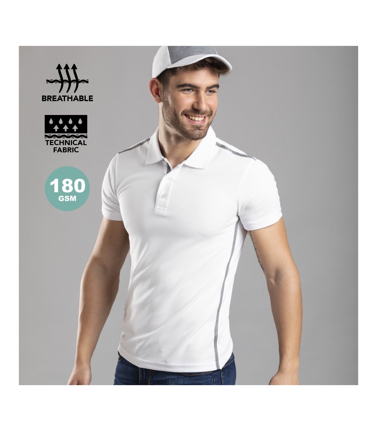 Polo técnico para adulto en poliéster transpirable de 180g/m². De elegante diseño bicolor, en color blanco con contraste de detalles en gris. Disponible en tallas S, M, L, XL, XXL. Color blanco especialmente fabricado para marcaje en sublimación.