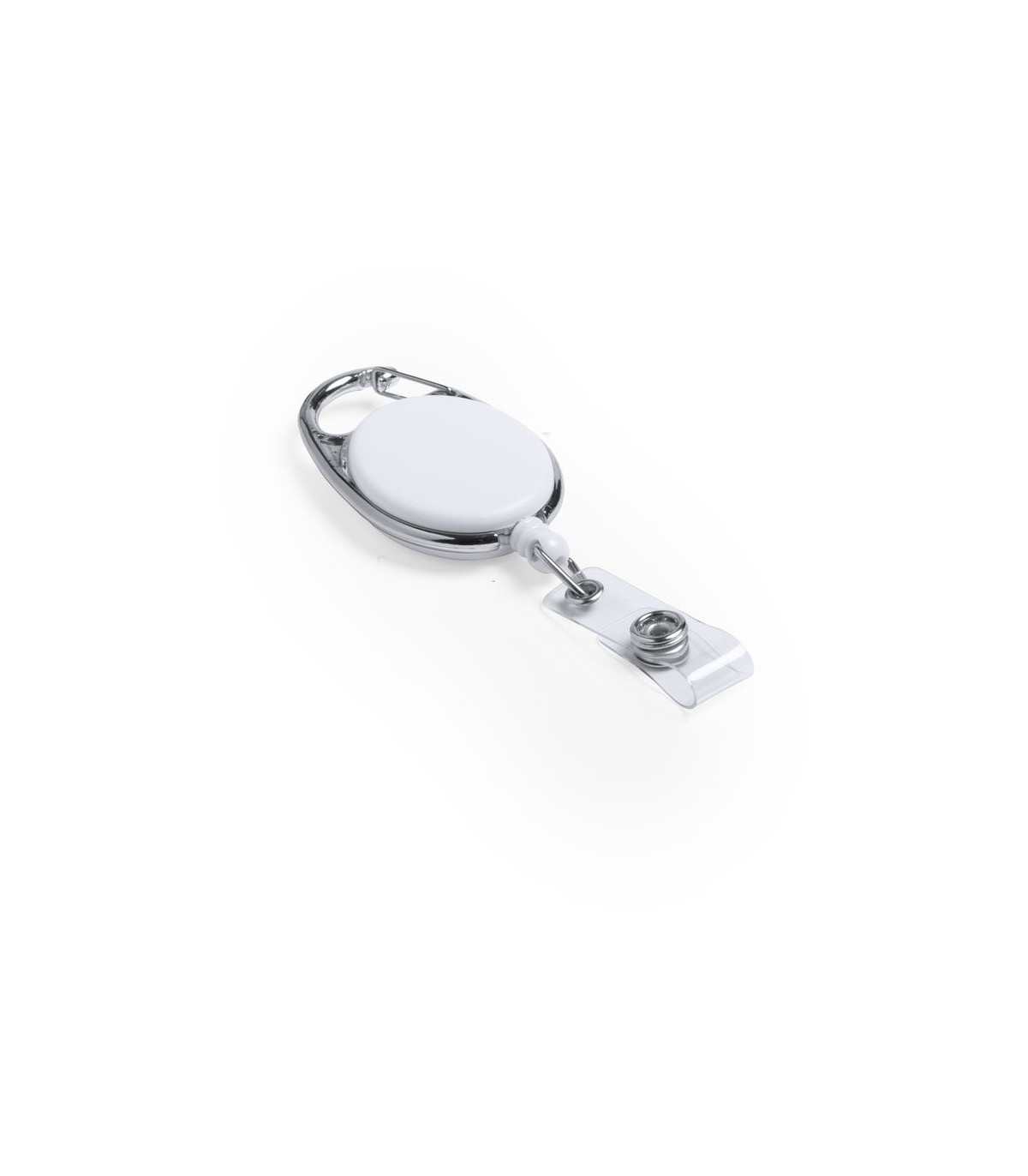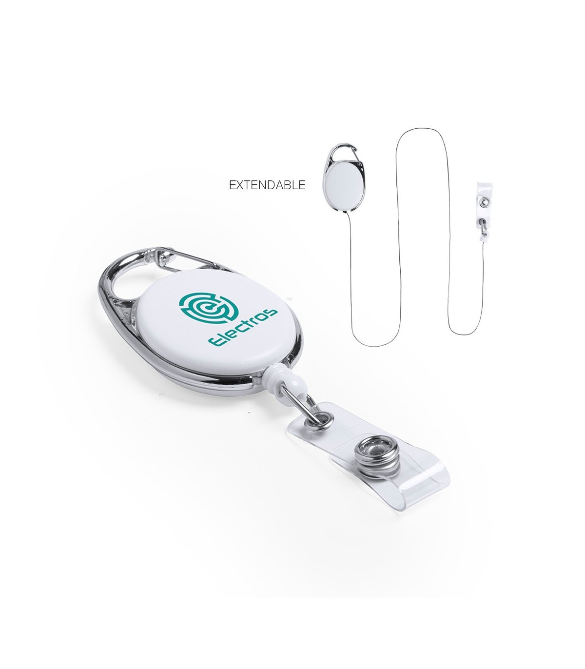 Porta acreditaciones extensible con accesorio de cierre de botón para colgar la acreditación y con mecanismo extensible de hasta 75 cm. Con mosquetón de enganche metálico.