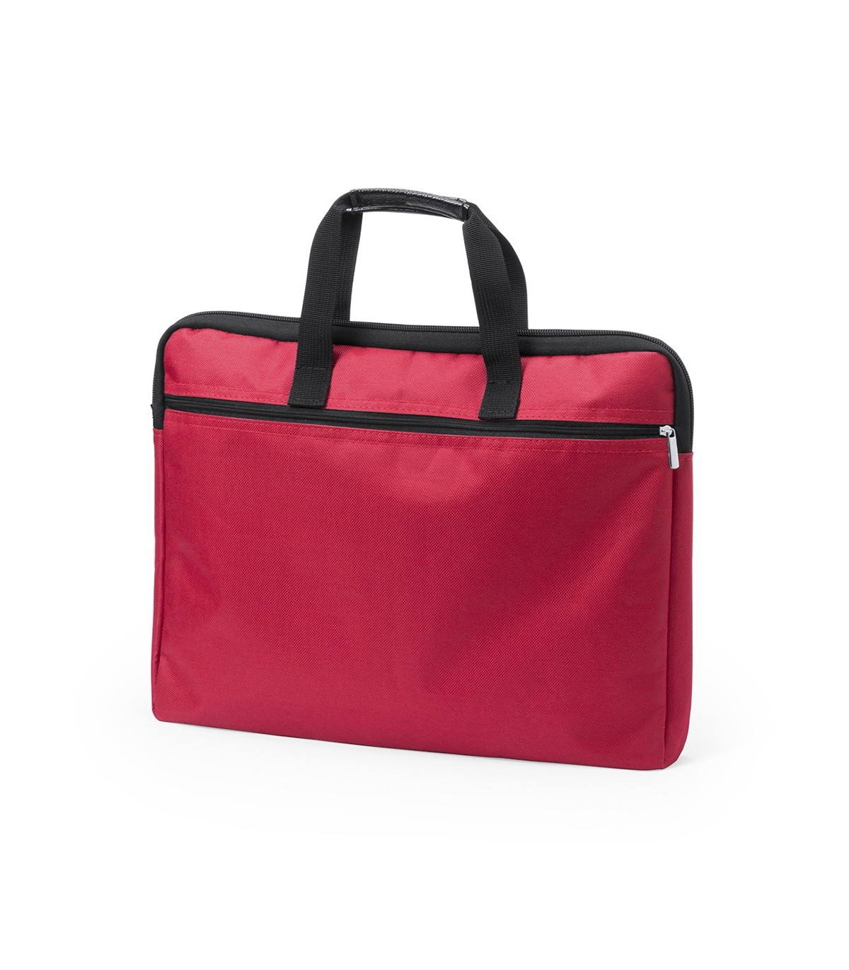 Portadocumentos acolchado de cierre de cremallera con bolsillo frontal, en suave acabado de poliéster 600D de vivos colores. Con asas de transporte con refuerzo de polipiel y cremalleras en elegante color negro a juego.