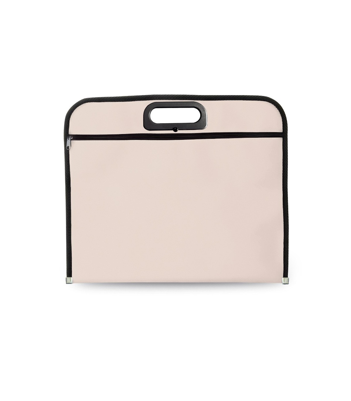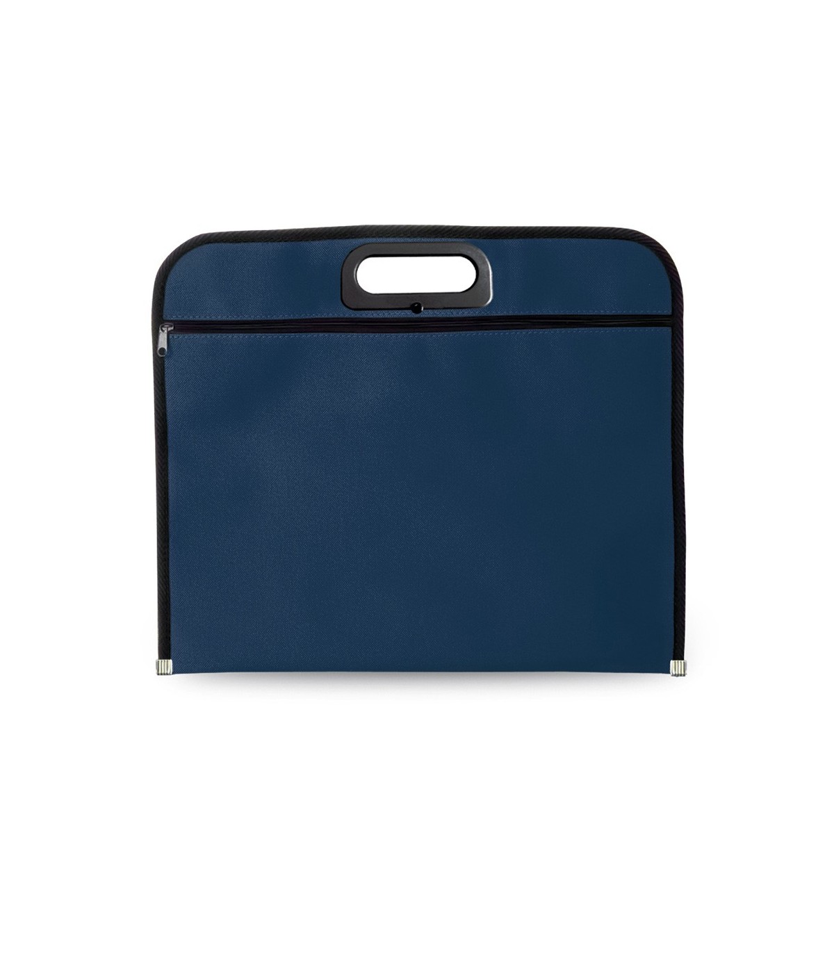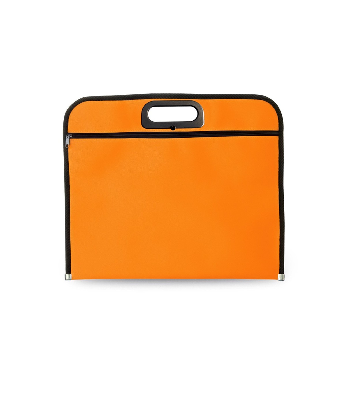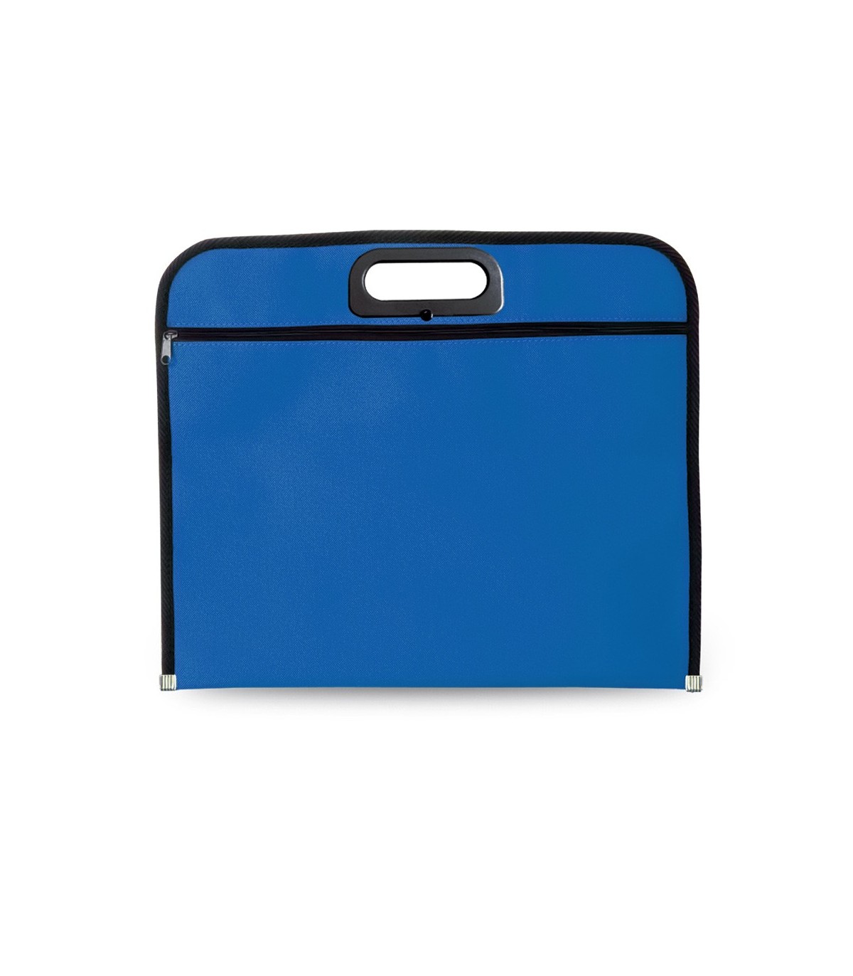 Portadocumentos de cierre de cremallera en suave acabado de poliéster 600D de vivos colores. Con asas de transporte de original diseño troquelado con refuerzo y ribetes en color negro con chapa metálica de refuerzo en la base.