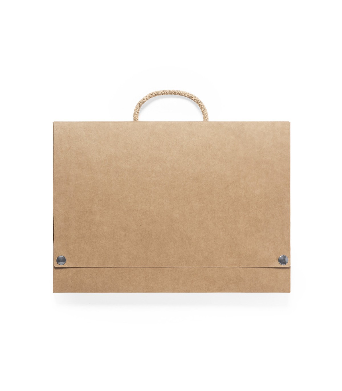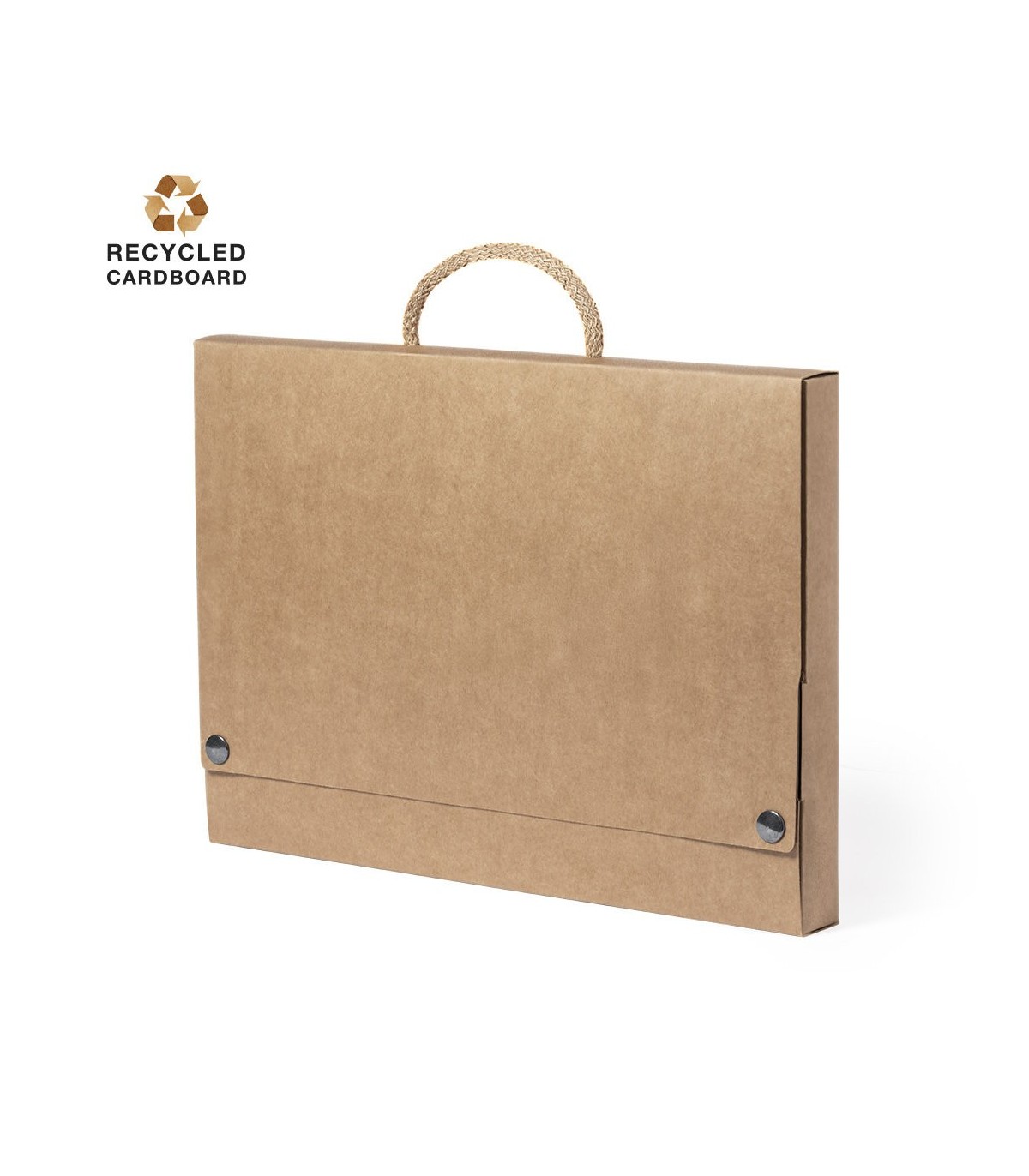 Portadocumentos ecológicos hechos en cartón reciclado de 530g/m². Con cierres de corchete metálicos negros en la solapa y resistente asa de transporte trenzada.