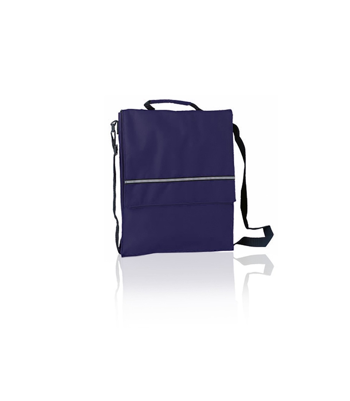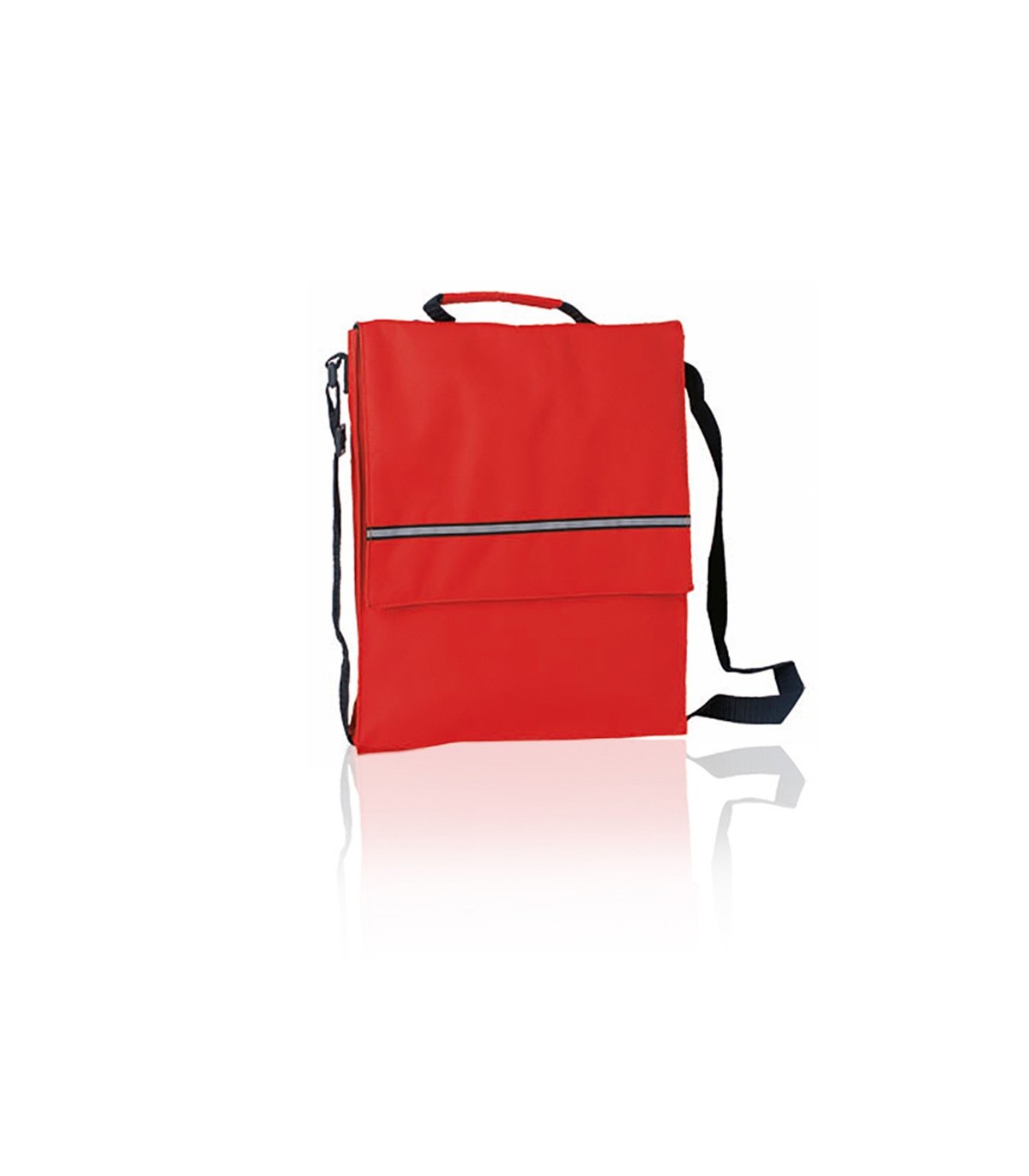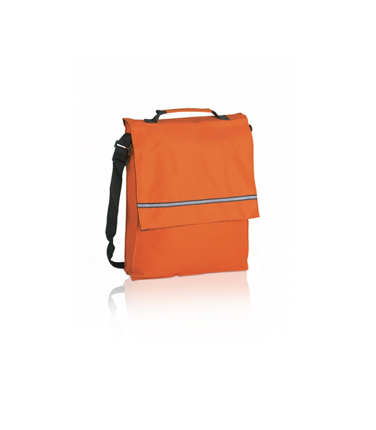 Portadocumentos con solapa de cierre de velcro en poliéster 600D de vivos colores y con franja frontal reflectante. Con asas reforzada a juego, cinta bandolera ajustable y compartimentos interiores con fundas para bolígrafos y smartphone.