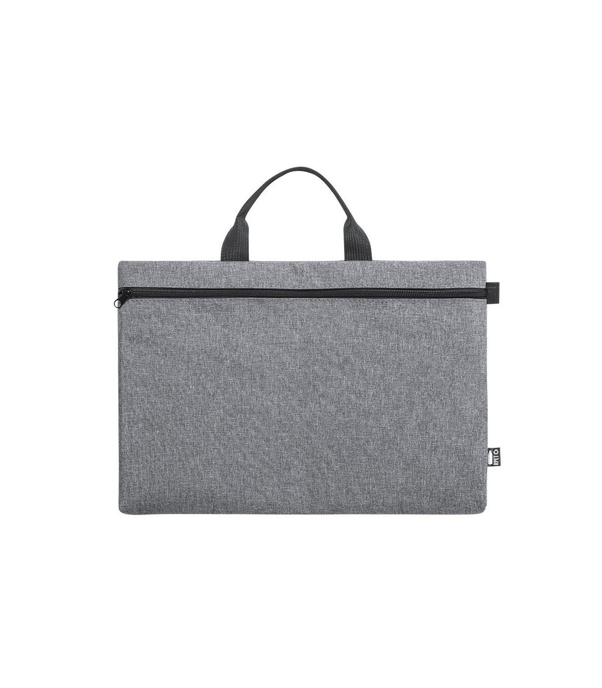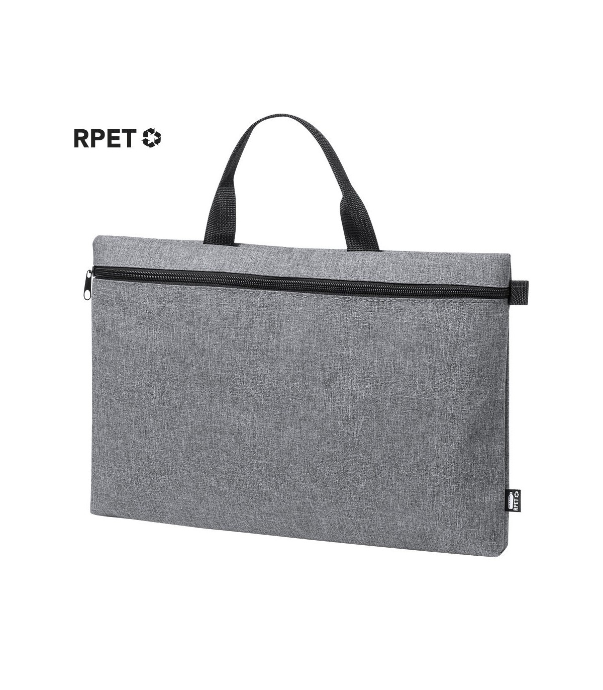 Portadocumentos hechos en plástico reciclado. Detalles en negro y compartimento principal con cierre de cremallera. Asas a juego y distintivo RPET en etiqueta exterior.