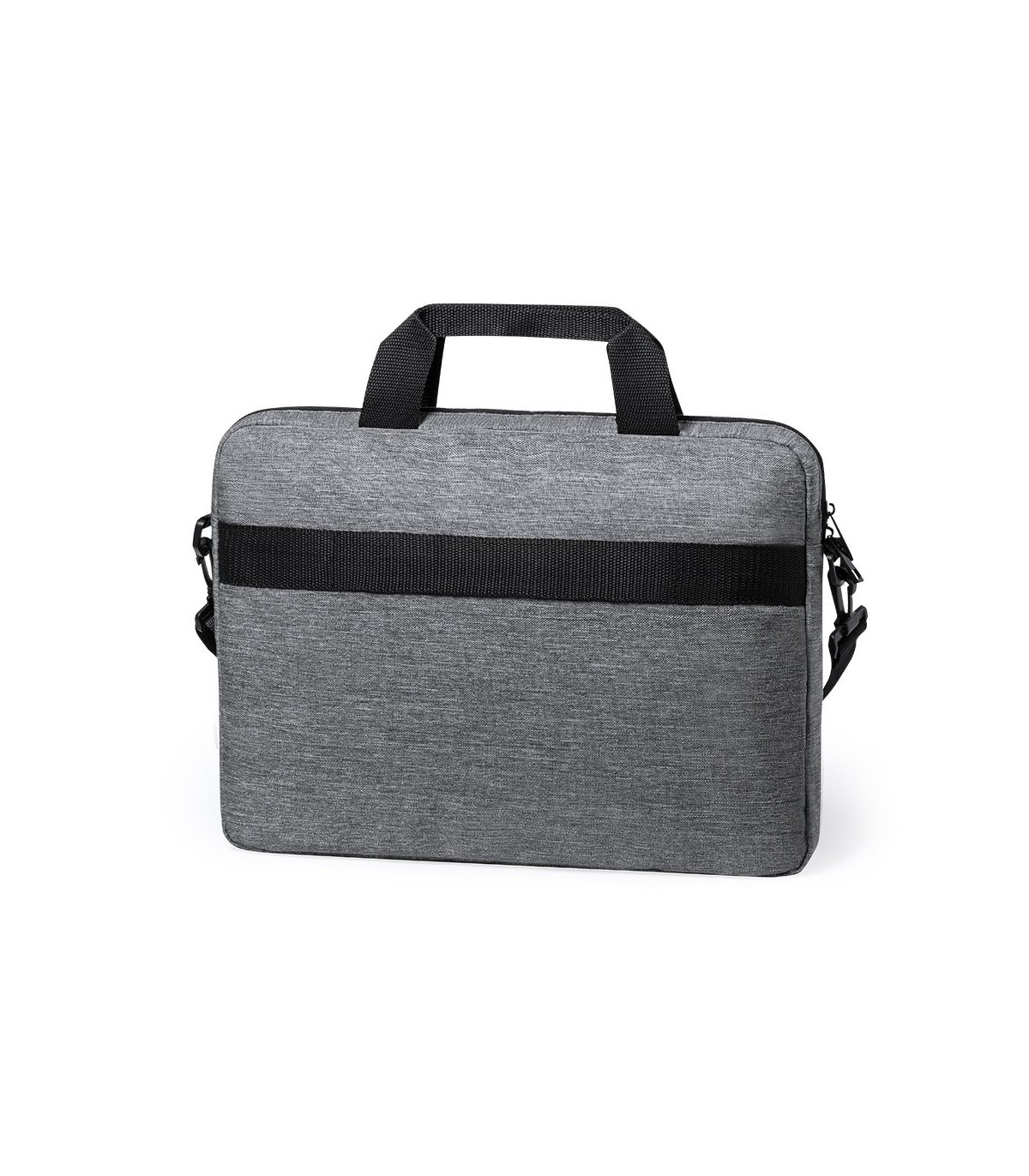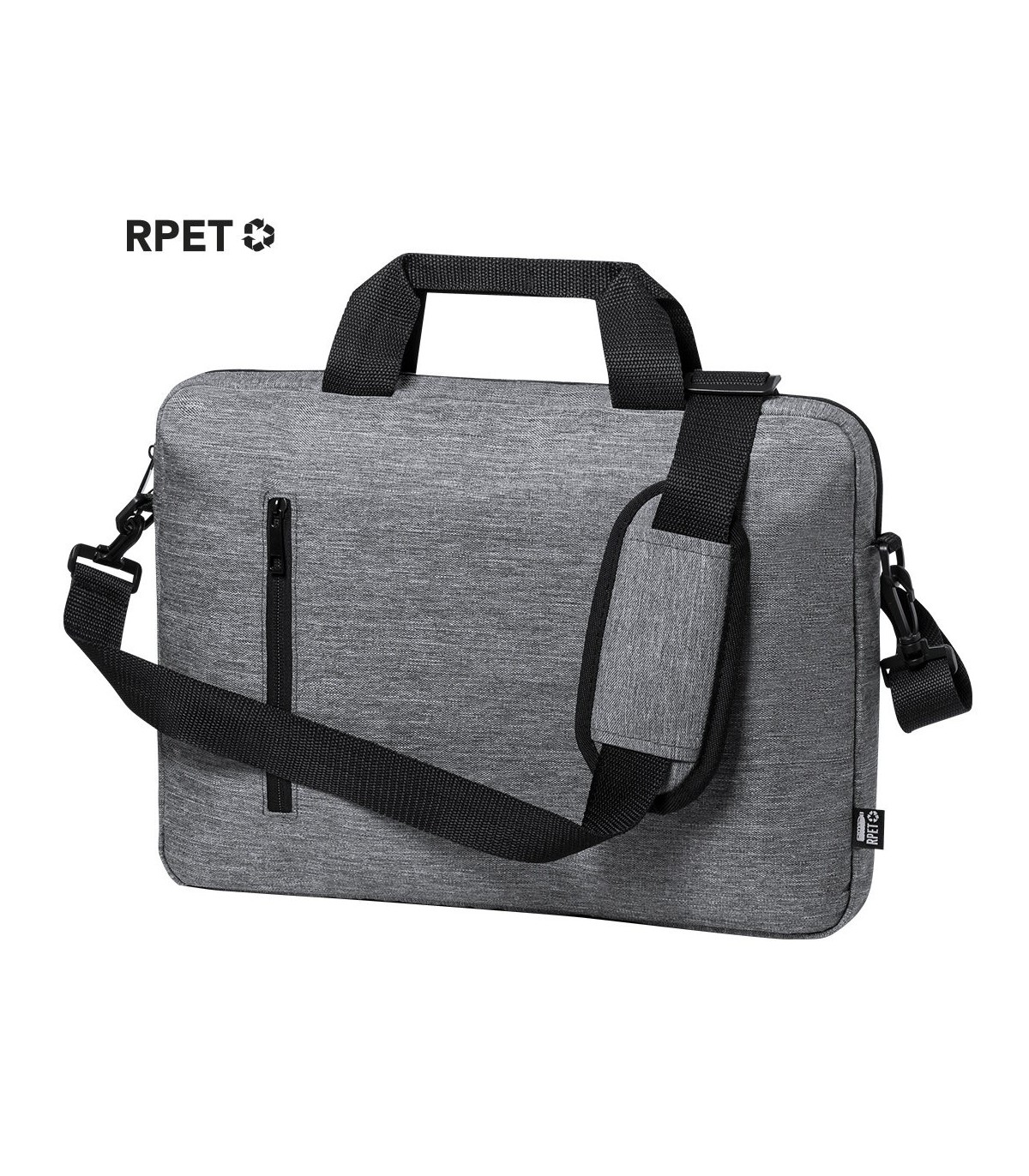 Elegante portadocumentos de línea ecológica en resistente 600D RPET efecto melange, elaborado a partir de plástico reciclado para así fomentar la reutilización de residuos plásticos y contribuir a la sostenibilidad del planeta. Detalles en negro, incluye compartimentos interiores acolchados para ordenador de hasta 15 pulgadas y tablet de hasta 10 pulgadas. Accesorio en parte posterior para anclaje al trolley, bolsillo exterior con cierre de cremallera, cómodas asas reforzadas, cinta bandolera ajustable con cierre de mosquetón y almohadilla para hombro a juego. Distintivo RPET en etiqueta exterior.