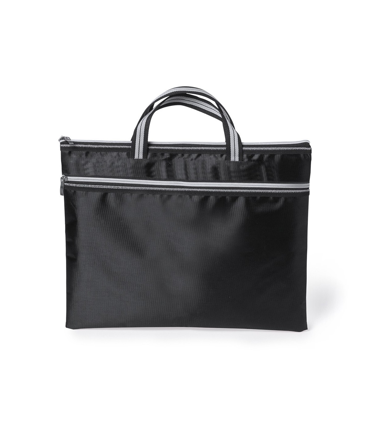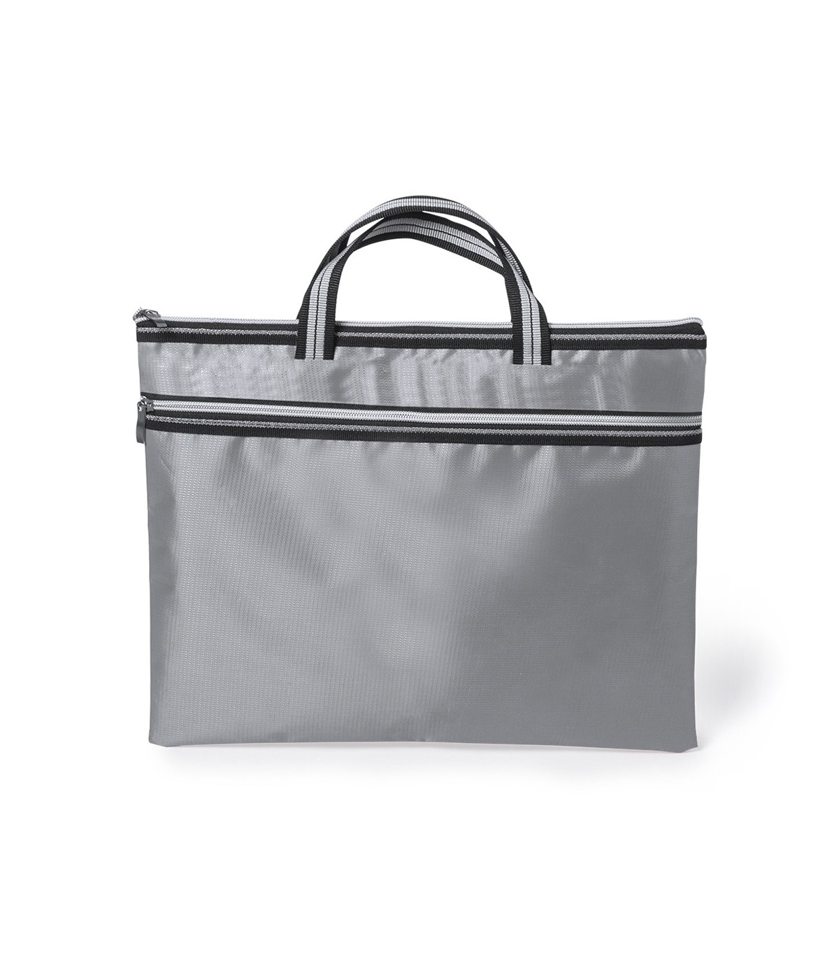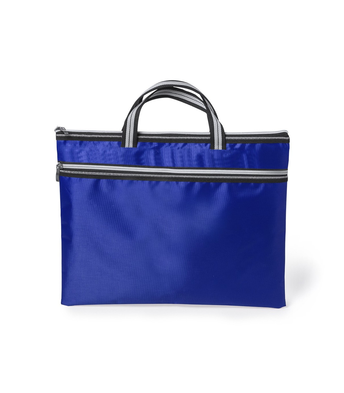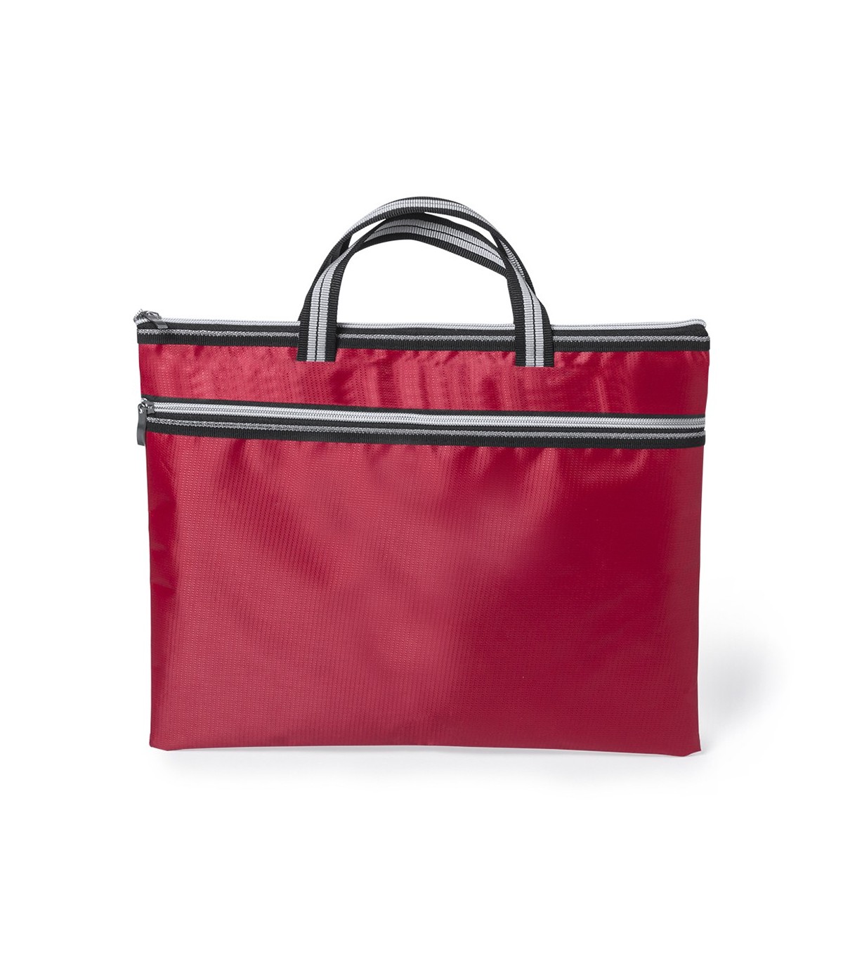 Portadocumentos de cierre de cremallera con bolsillo frontal en suave acabado de poliéster 300D de vivos colores. Con asas de transporte de original diseño bicolor a juego con cremalleras.
