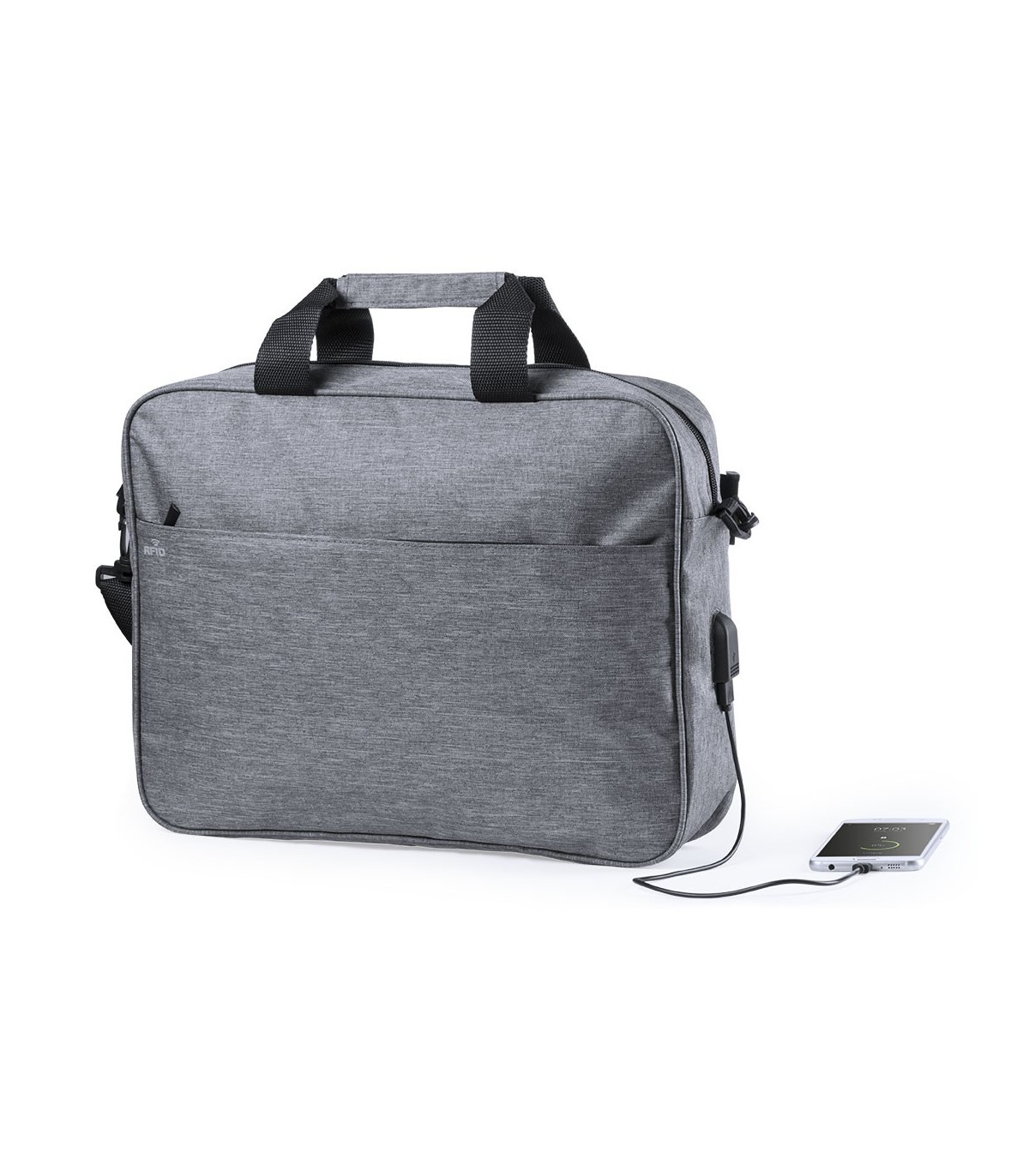 Portadocumentos de seguridad, con diseño urbano en resistente poliéster 300D. Bolsillo interior con protección de seguridad RFID (Identificación por Radio Frecuencia) que mantiene seguros los datos de la tarjeta y demás dispositivos. Asas con protección y compartimento principal con cierre de cremallera. Conexión USB -powerbank no incluido-, con bolsillos interiores acolchados para ordenador portátil de hasta 15 pulgadas y tablets de hasta 10 pulgadas. Cinta para hombro ajustable con protector acolchado.