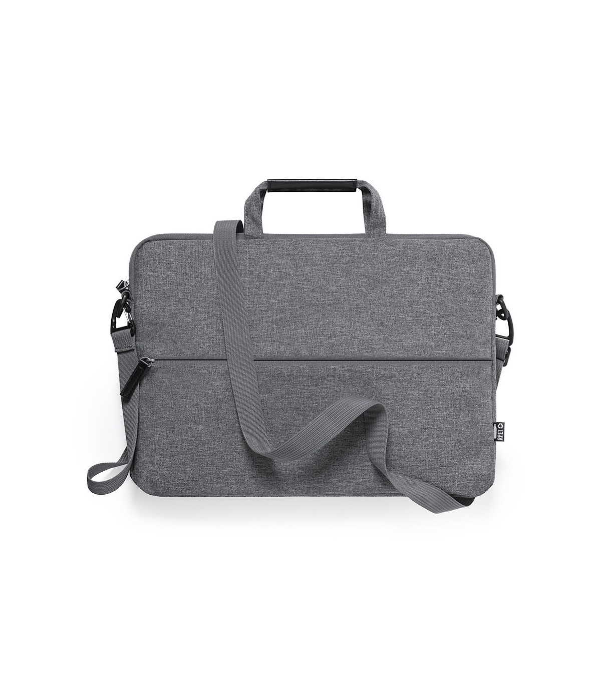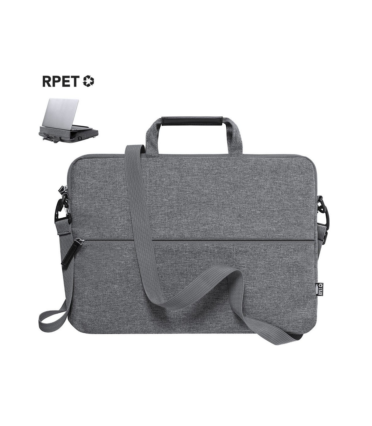 Portadocumentos de fabricación ecológica y en resistente 300D RPET efecto melange, elaborado a partir de plástico reciclado, para así fomentar la reutilización de residuos plásticos y contribuir a la sostenibilidad del planeta. Con original soporte integrado para ordenador portátil, bolsillos principal y frontal con cierre de cremallera. Interior con bolsillo acolchado para portátil de hasta 15 pulgadas y bolsillo para tablet de hasta 10 pulgadas. Cinta bandolera ajustable para hombro, con asa de transporte reforzada. Resistencia hasta 6kg, con distintivo RPET en etiqueta exterior.