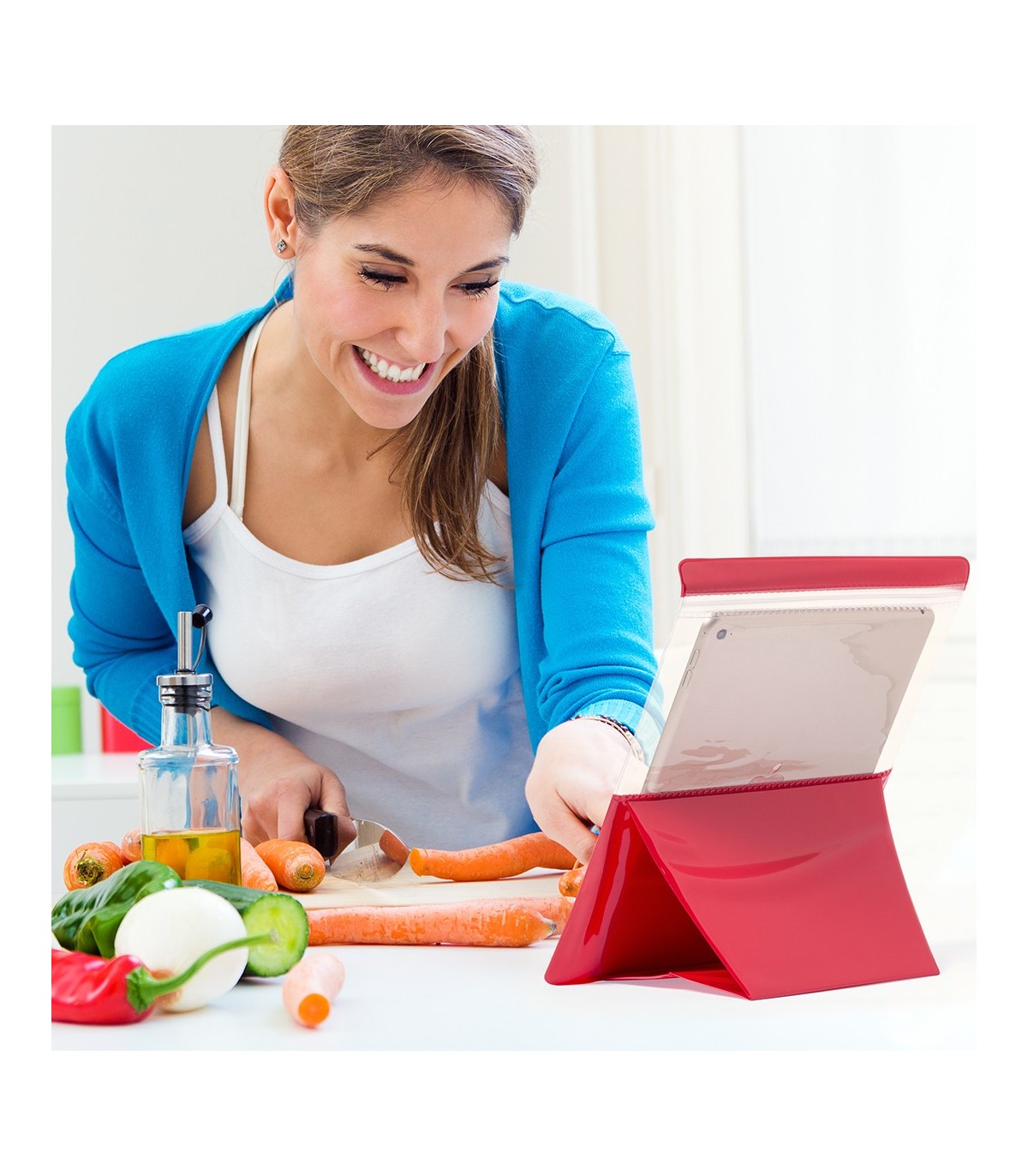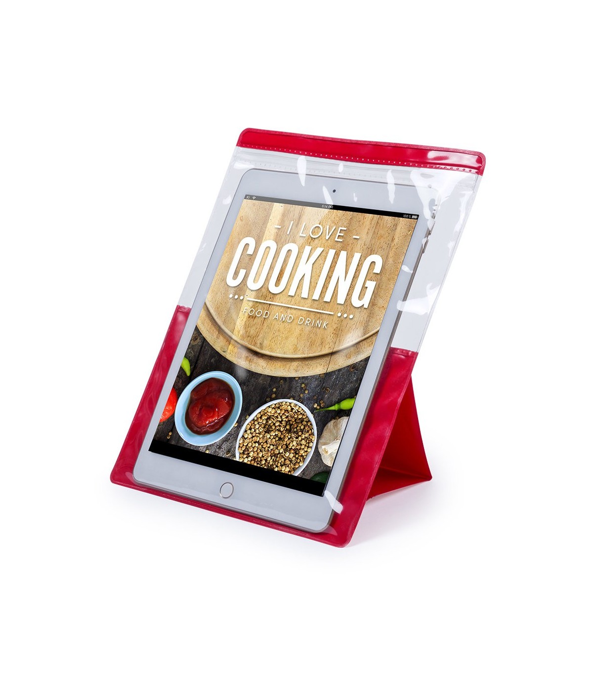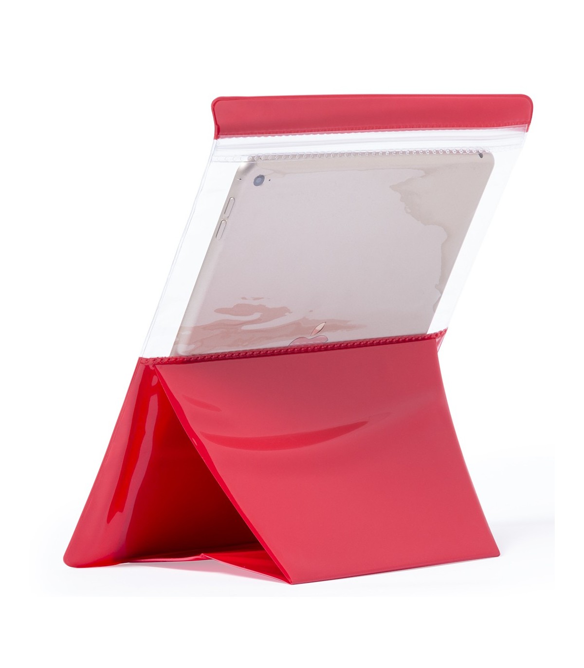 Práctico portatodo impermeable en PVC en atrevido diseño bicolor, con función táctil y soporte integrado. Diseñado especialmente para tablets de hasta 9,7 pulgadas.