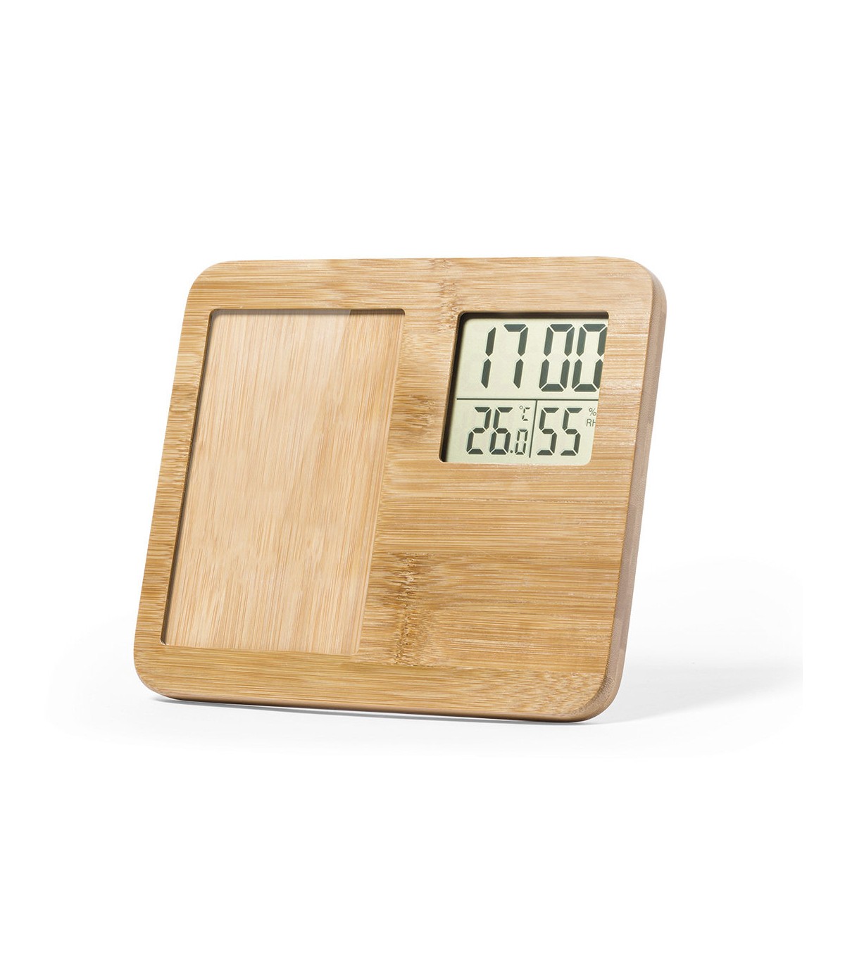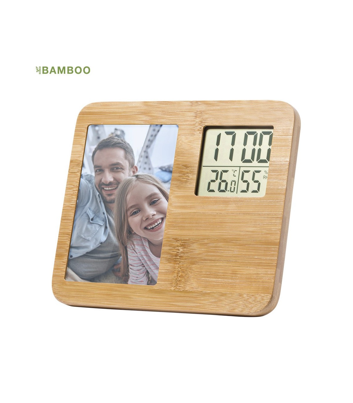 Portafotos estación meteorológica ecológicos con funciones termómetro, higrómetro y reloj. Para fotos de 9x14cm y con reloj con alimentación a pilas (de botón incluidas).