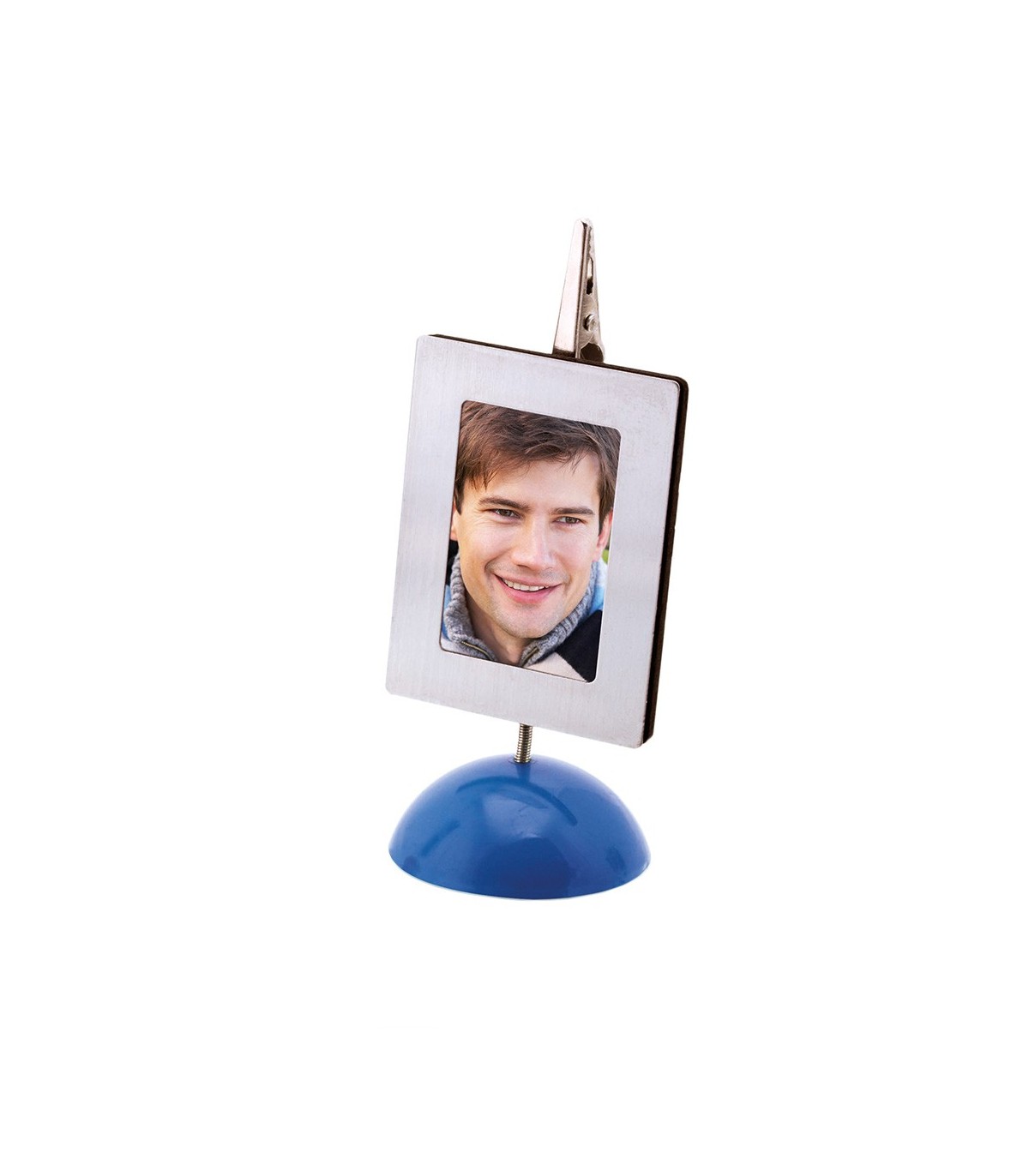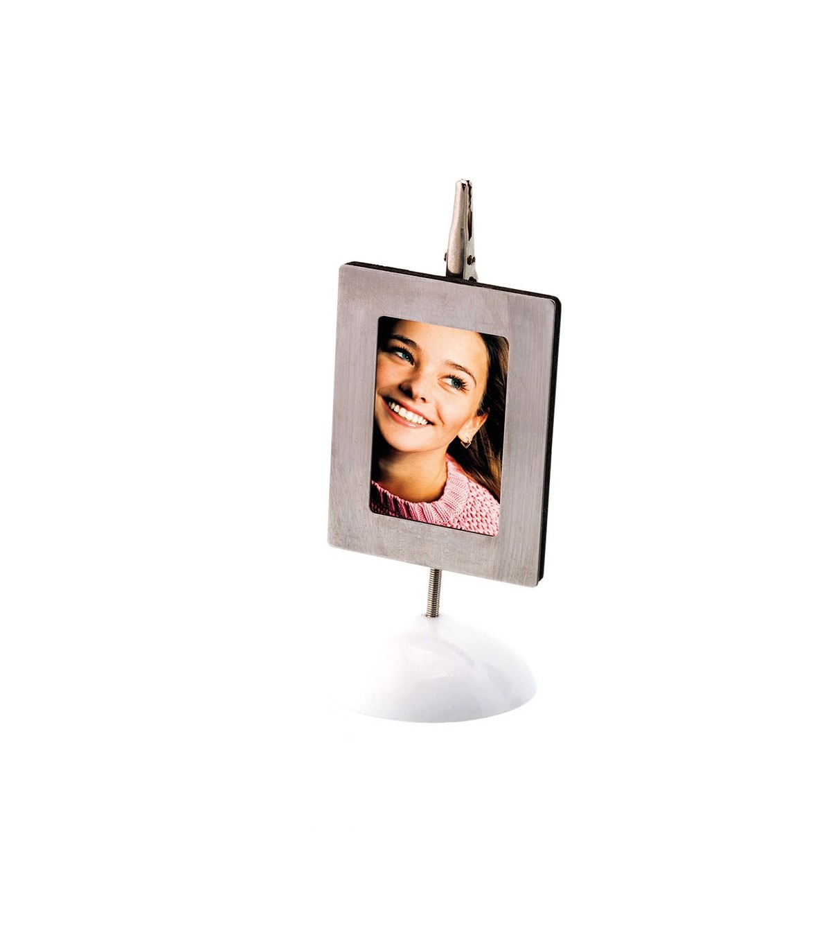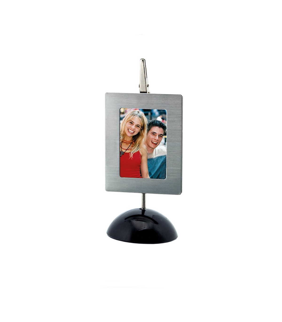 Portafotos de escritorio con clip portanotas metálico, marco imantado en acero inox y resistente base antideslizante en variados colores. Presentado en caja de PVC