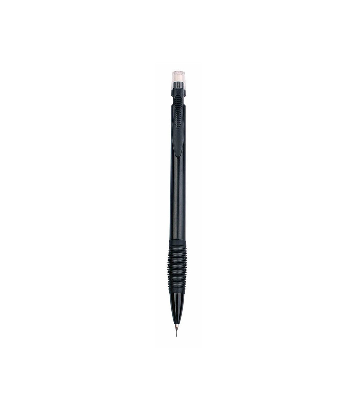 Portaminas de plástico con grid negro de goma con líneas circulares para facilitar el agarre, Minas de 0,5 mm y goma de borrar tapa transparente. Portaminas Penzil.