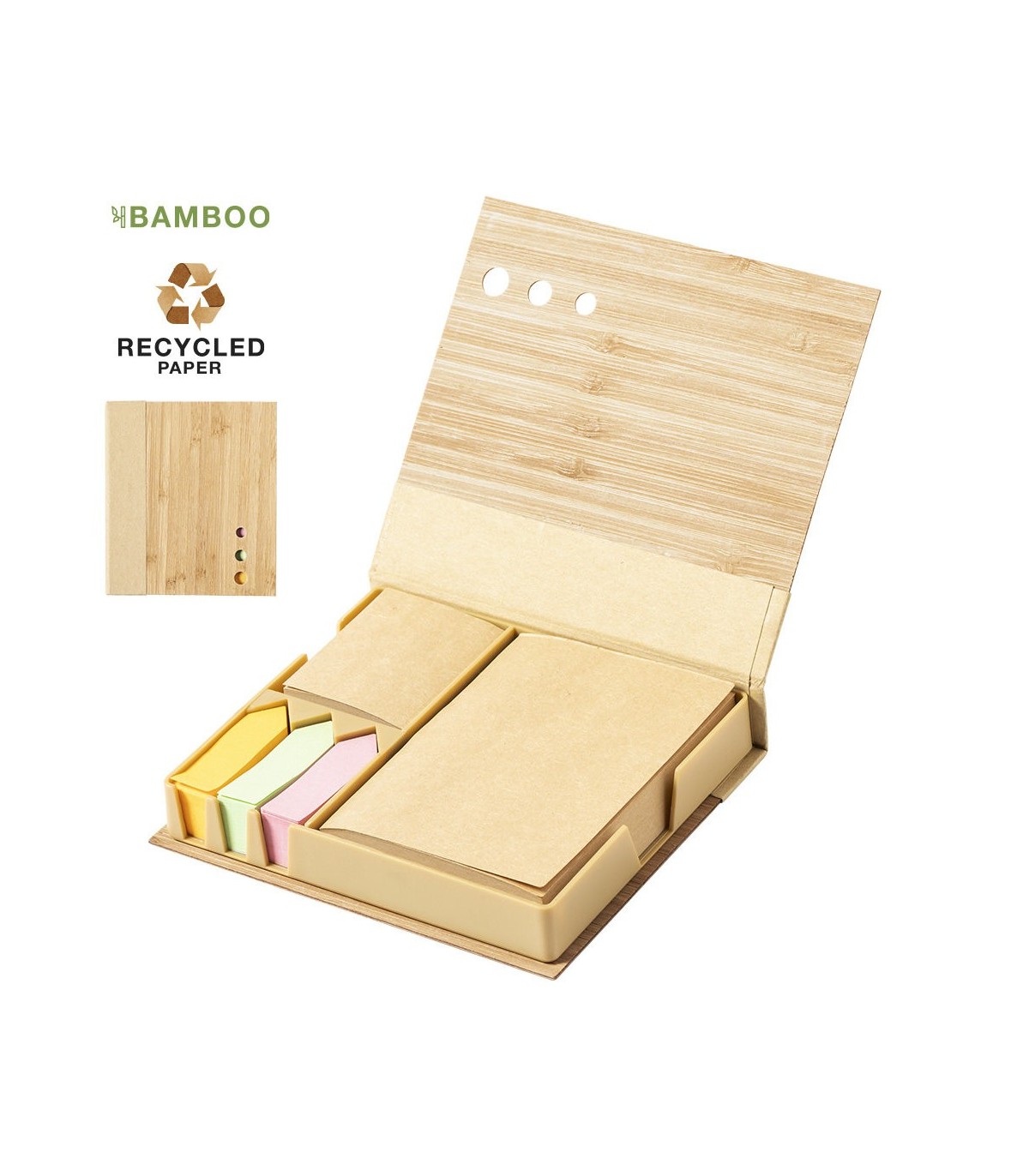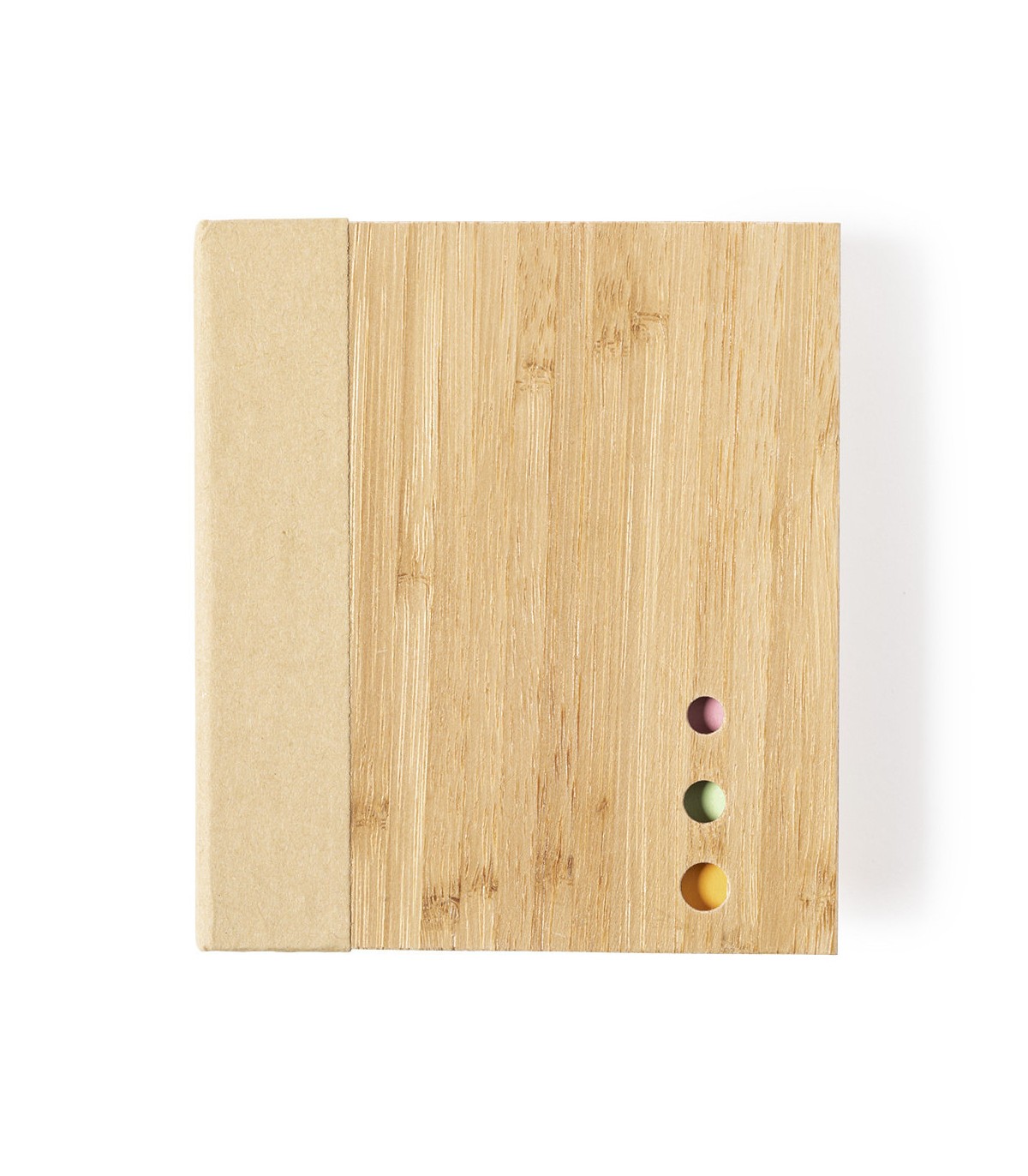 Portanotas personalizados de linea nature con tapas rígidas de bambú. Con 115 hojas adhesivas de acabado kraft, 115 hojas adhesivas medianas y 420 mini notas adhesivas.