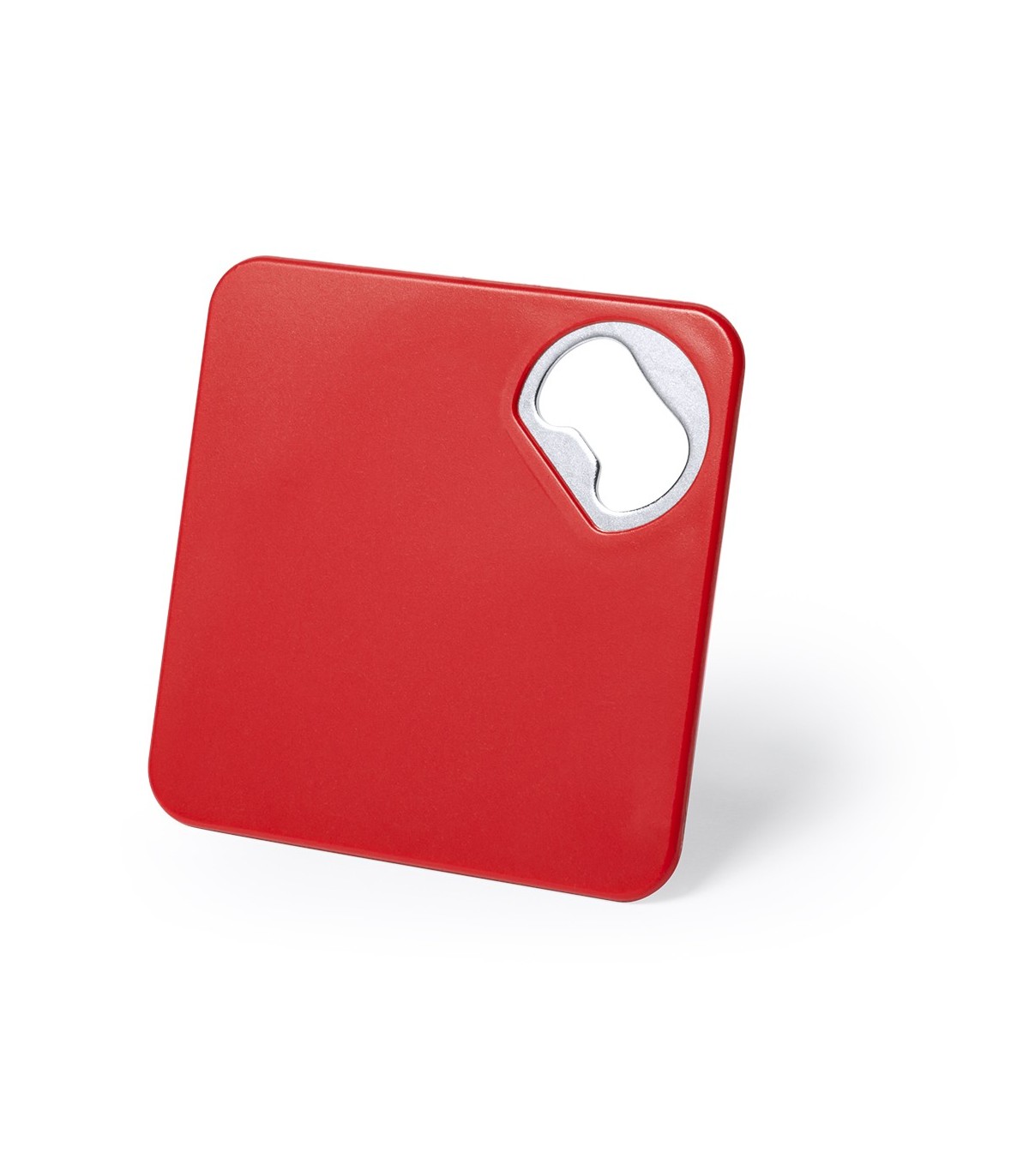 Original posavasos con abridor metálico integrado en varios colores llamativos para imprimir. Con superficie anti deslizante en la base.