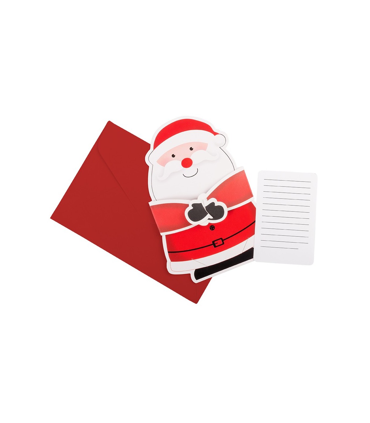 Original carta para los regalos navideños con sobre en color rojo con diseño de Papá Noel y tarjeta interior con distribución de una raya.