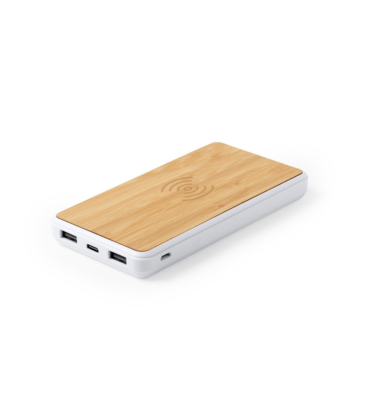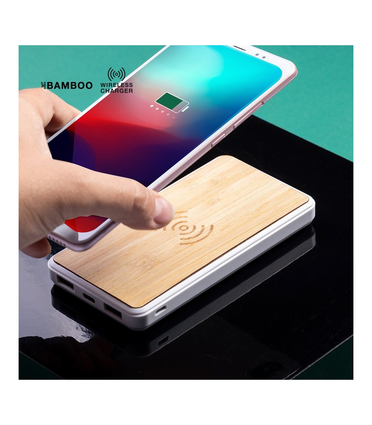 Batería auxiliar externa de línea ecológica, con cargador inalámbrico integrado y carcasa en madera de bambú. 8.000 mAh de capacidad de carga e indicador de estado de carga. Salida doble USB y entradas Tipo C y micro USB -cable incluido-. Con amplia superficie de marcaje y presentada en atractiva caja de diseño. Las capacidades mostradas en todas nuestras baterías auxiliares externas son reales, incorporando todas ellas baterías de grado A y no recicladas, con una vida útil de al menos 500 ciclos de carga y según normativa CE. Además, están fabricadas conforme a los estándares RoHS y en cumplimiento con los siguientes requisitos de seguridad: Sistema de protección contra sobrecarga del power bank. Sistema de protección contra descarga completa que proporciona una mayor durabilidad del power bank. Sistema de bloqueo para evitar cortocircuitos. Sistema de transferencia de carga constante, acorde con la capacidad del dispositivo de destino.