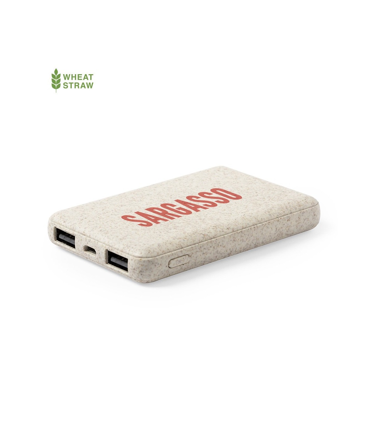 Baterías auxiliares ecológicas personalizadas en caña de trigo, 5.000 mAh de carga. Salida USB dual para carga simultánea de 2 dispositivos y entrada micro USB.