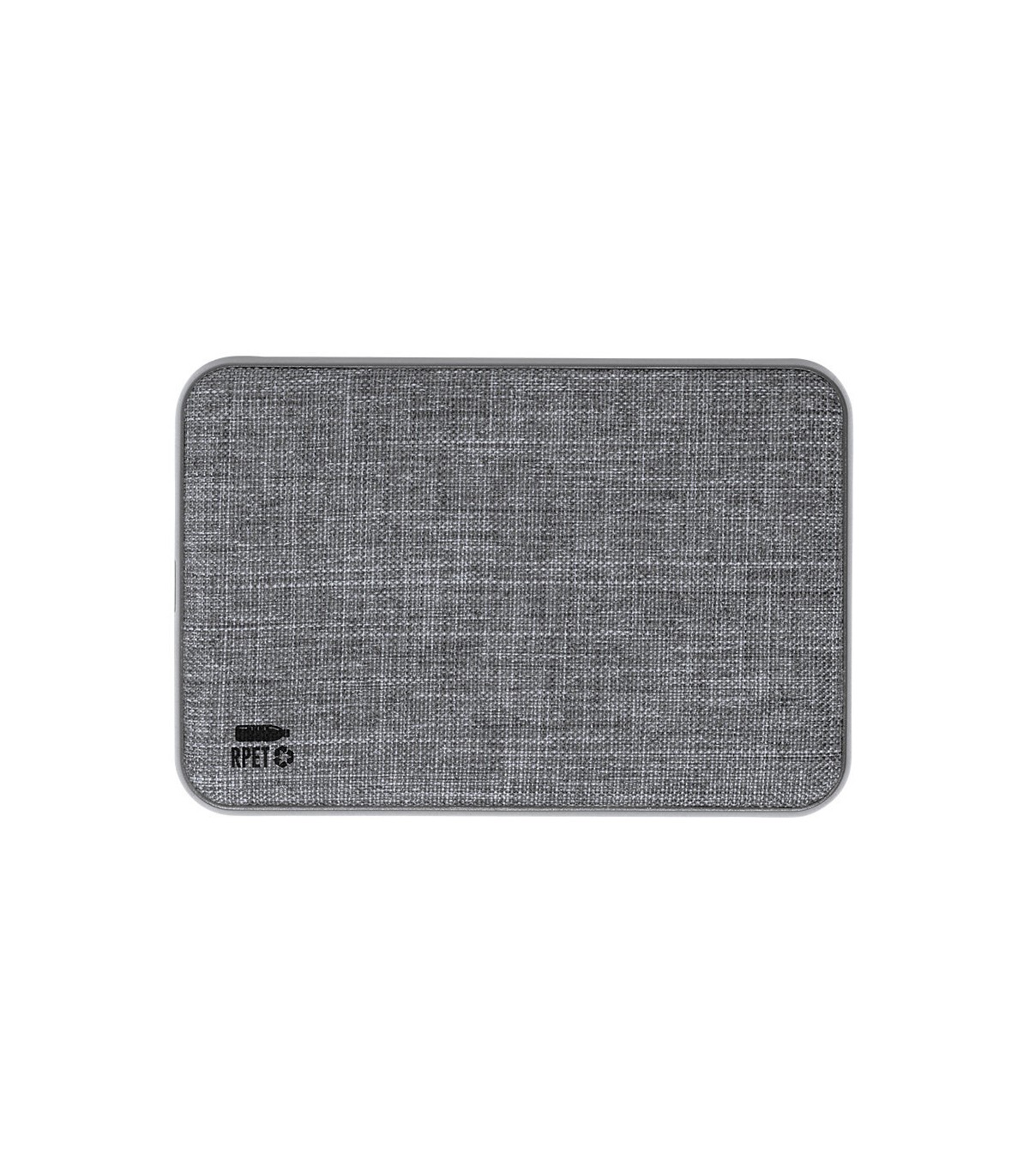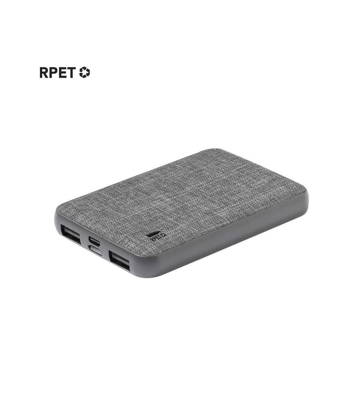 Batería auxiliar externa de elaboración ecológica y fabricada en poliéster RPET, hecho a partir de plástico reciclado, para así fomentar la reutilización de residuos plásticos y ayudar a la sostenibilidad del planeta. 5.000 mAh de capacidad, con indicador de estado de carga. Entrada Micro USB y Tipo C. 2 salidas USB. Cable de carga micro USB incluido. Con amplia superficie de marcaje y presentado en atractiva caja de diseño eco. Distintivo RPET sobre el artículo. Las capacidades mostradas en todas nuestras baterías auxiliares externas son reales, incorporando todas ellas baterías de grado A y no recicladas, con una vida útil de al menos 500 ciclos de carga y según normativa CE. Además, están fabricadas conforme a los estándares RoHS y en cumplimiento con los siguientes requisitos de seguridad: Sistema de protección contra sobrecarga del power bank. Sistema de protección contra descarga completa que proporciona una mayor durabilidad del power bank. Sistema de bloqueo para evitar cortocircuitos. Sistema de transferencia de carga constante, acorde con la capacidad del dispositivo de destino. 5000 mAh. 2 Salidas USB. Entrada Micro USB y Tipo C.