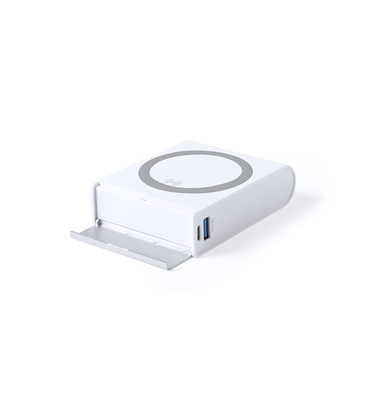 Power bank de carga inalámbrica rápida con capacidad -8.000 mAh- Conexión tipo C y con soporte para dispositivo móvil, ledes indicadores de estado de carga y amplia superficie de marcaje.