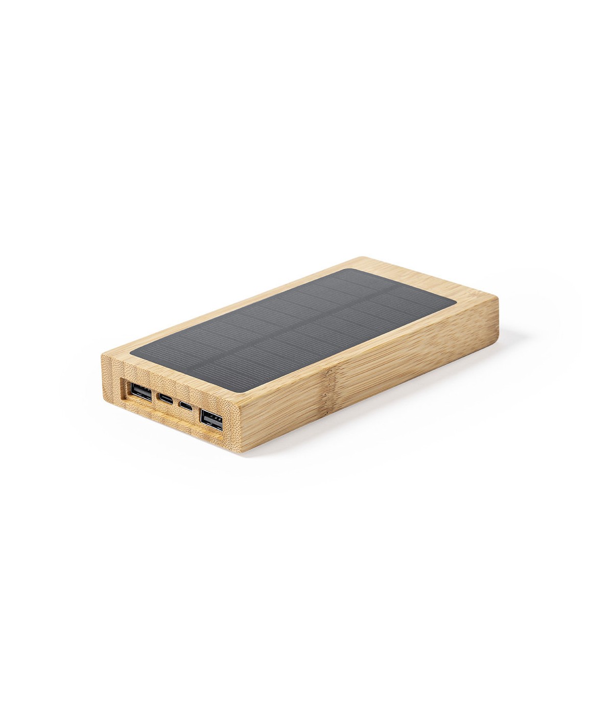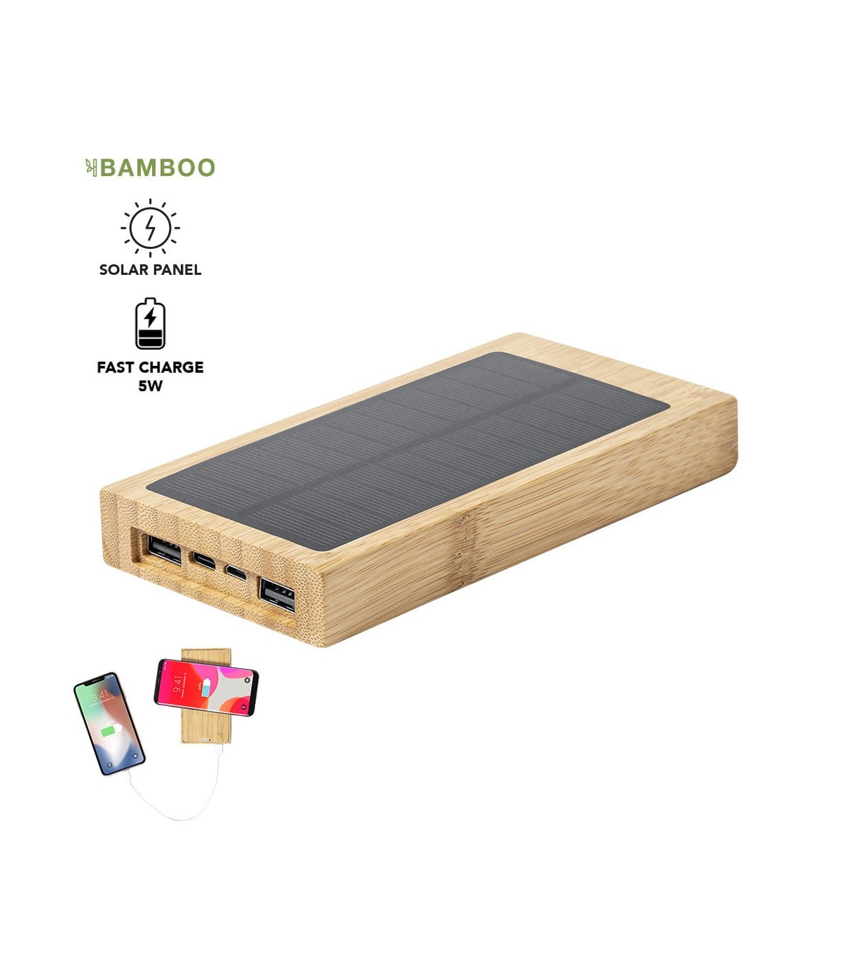 Batería auxiliar externa de elaboración ecológica con capacidad de 10.000 mAh. Incluye Cargadores inalámbricos de 5W, apto para todos los dispositivos compatibles con carga inalámbrica, y un panel de carga solar. Fabricada en bambú procedente de bosques sostenibles con certificación FSC. Cuenta con 2 salidas USB, 1 entrada Micro USB, y una entrada tipo C. Cable de carga micro USB incluido. Con indicador de estado de carga y presentada en atractiva caja de diseño eco. Distinción FSC sobre el producto. Las capacidades mostradas en todas nuestras baterías auxiliares externas son reales, incorporando todas ellas baterías de grado A y no recicladas, con una vida útil de al menos 500 ciclos de carga y según normativa CE. Además, están fabricadas conforme a los estándares RoHS y en cumplimiento con los siguientes requisitos de seguridad: Sistema de protección contra sobrecarga del power bank. Sistema de protección contra descarga completa que proporciona una mayor durabilidad del power bank. Sistema de bloqueo para evitar cortocircuitos. Sistema de transferencia de carga constante, acorde con la capacidad del dispositivo de destino. Inalámbrico 5W. 10000 mAh. 2 Salidas USB. Entrada Micro USB y Tipo C.