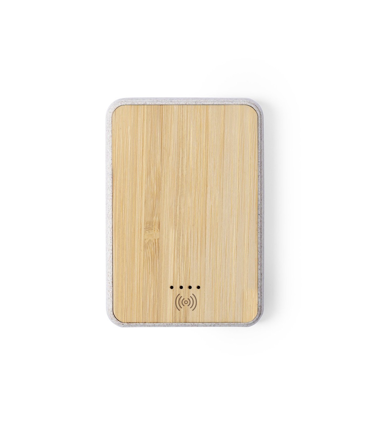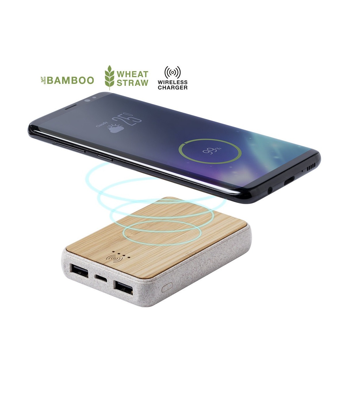 Batería auxiliar externa de línea ecológica con cargador inalámbrico 5W integrado. Carcasa en combinación de materiales bambú y caña de trigo. 5.000 mAh de capacidad e indicador de estado de carga. Doble salida USB y entrada Tipo C. Con amplia superficie de marcaje y presentado en atractiva caja de diseño eco. Las capacidades mostradas en todas nuestras baterías auxiliares externas son reales, incorporando todas ellas baterías de grado A y no recicladas, con una vida útil de al menos 500 ciclos de carga y según normativa CE. Además, están fabricadas conforme a los estándares RoHS y en cumplimiento con los siguientes requisitos de seguridad: Sistema de protección contra sobrecarga del power bank. Sistema de protección contra descarga completa que proporciona una mayor durabilidad del power bank. Sistema de bloqueo para evitar cortocircuitos. Sistema de transferencia de carga constante, acorde con la capacidad del dispositivo de destino.