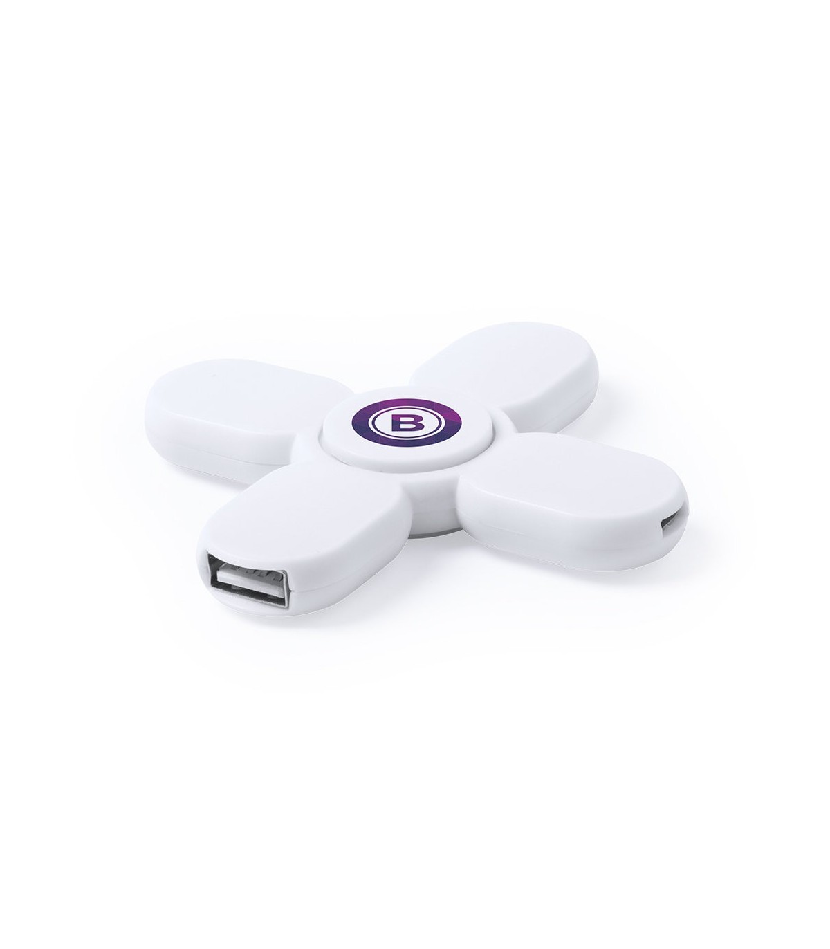 Original puerto USB con spinner antiestrés acabado en color blanco. Incluye 3 puertos USB 2.0 y pastilla central especialmente diseñada para marcaje en tampografía.