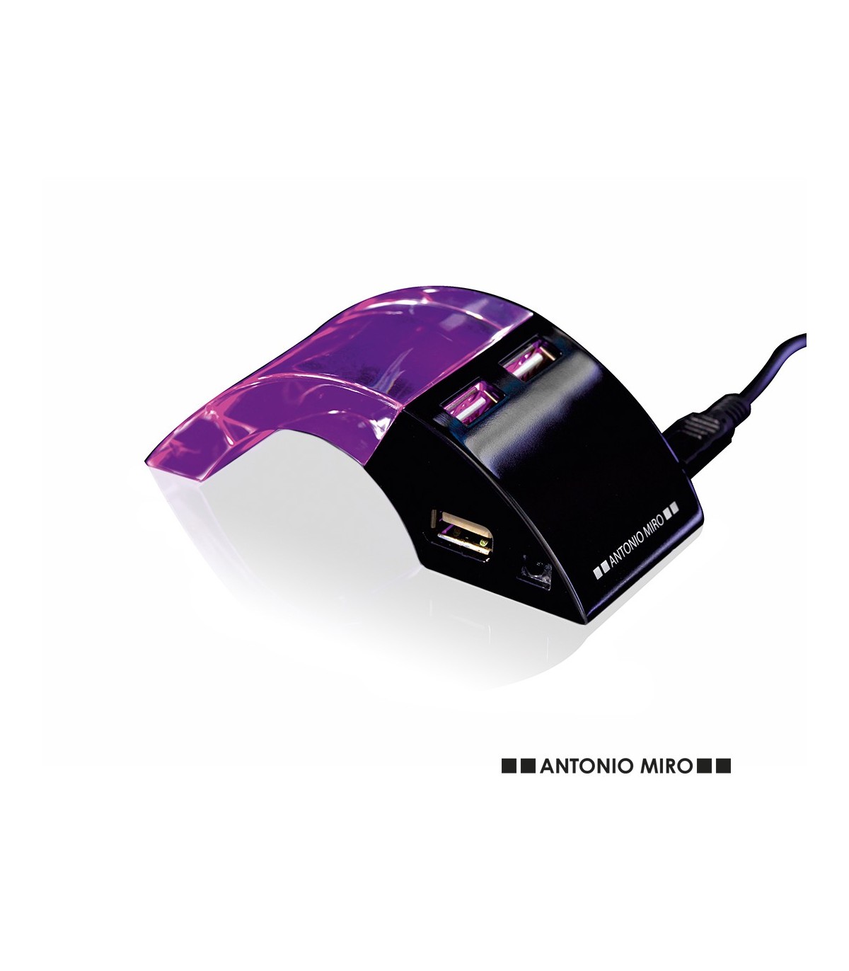 Puerto USB de Antonio Miró en color negro y transparente. Con 4 puertos USB y zona transparente con luz led multicolor. Con cable USB y presentado en caja individual.