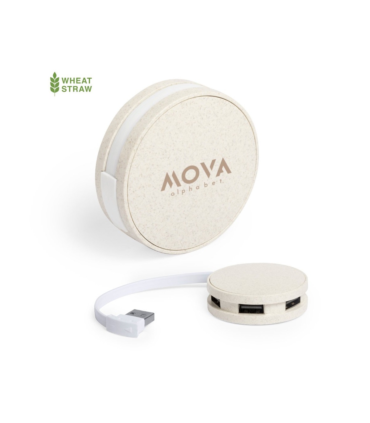 Original y compacto puerto USB de forma redondeada de línea ecológica. Carcasa en caña de trigo, para así fomentar la utilización de materias primas naturales y reducir las emisiones contaminantes. Con 4 puertos USB 2.0 para conectar multitud de dispositivos y amplia superficie de marcaje. Embalaje en empaque individual de diseño eco.