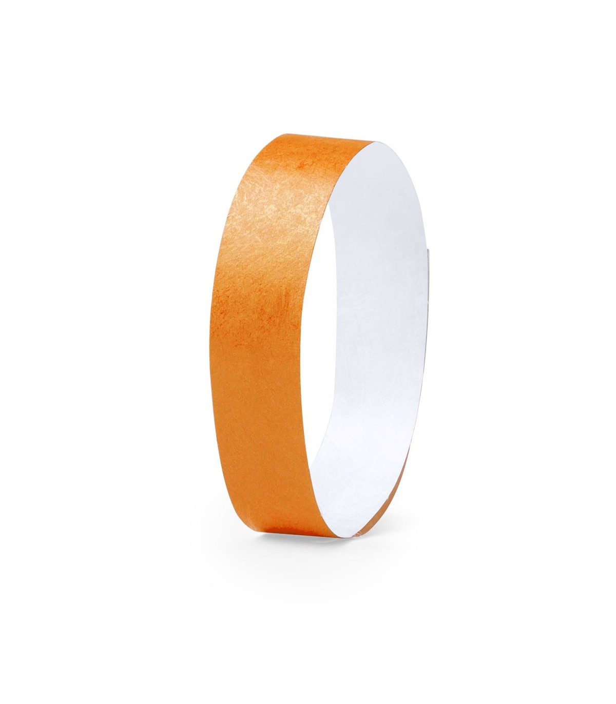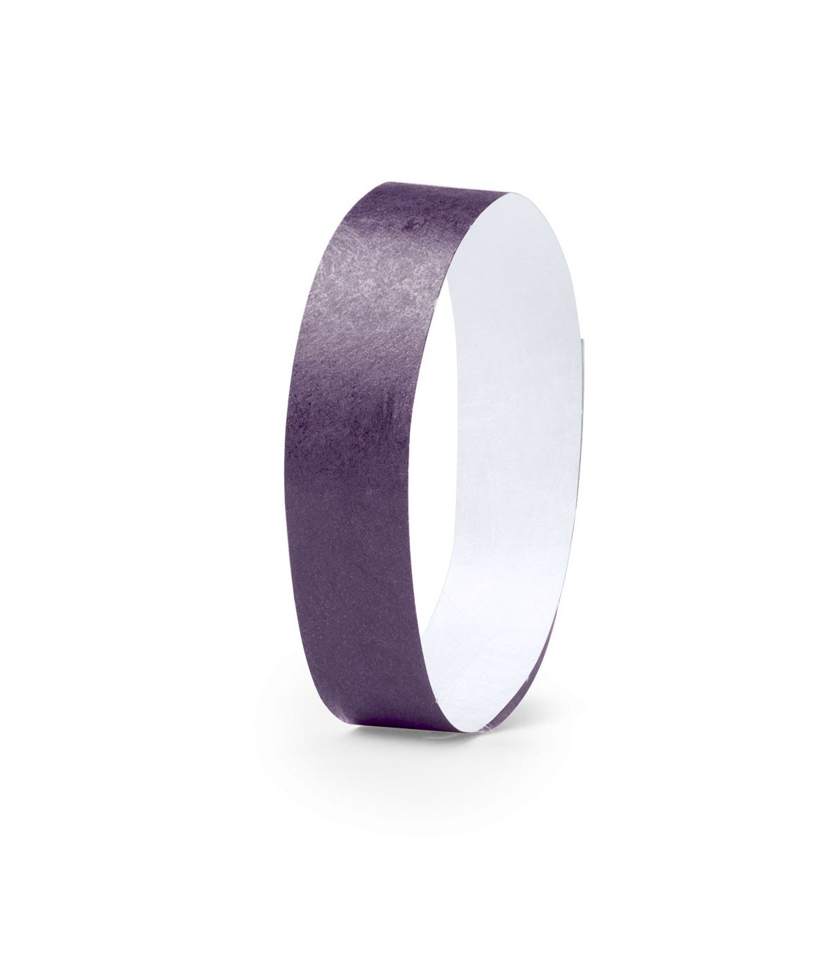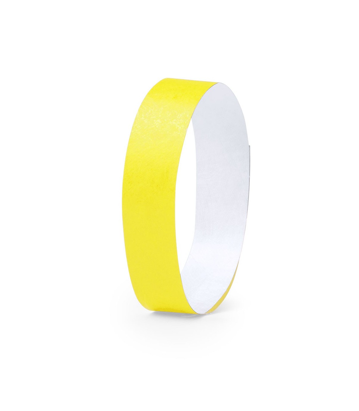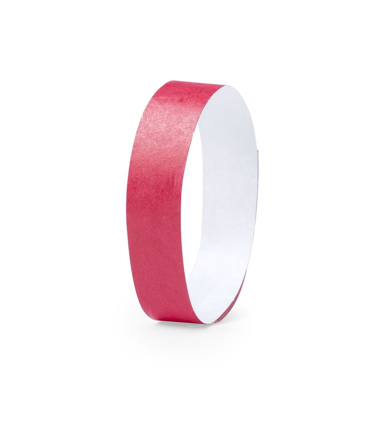 Pulsera para eventos en fibra sintética y variada gama de vivos colores. Con cierre adhesivo, resistente al agua y presentada en plancha troquelada de 10 piezas con numeración individual.
