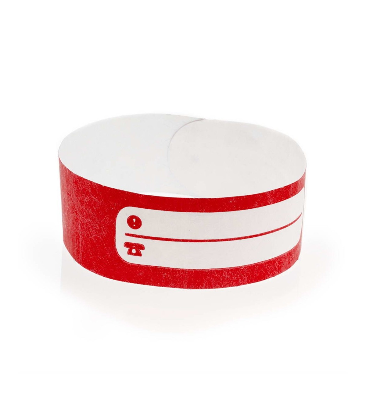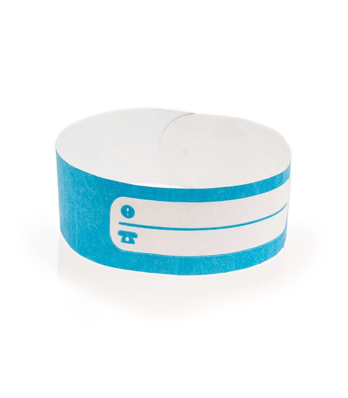 Pulsera en fibra sintética para niño en variada gama de vivos colores. Con campos de identificación, de cierre adhesivo, resistente al agua y presentada en plancha troquelada de 10 piezas.