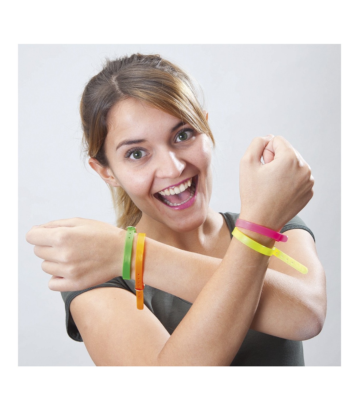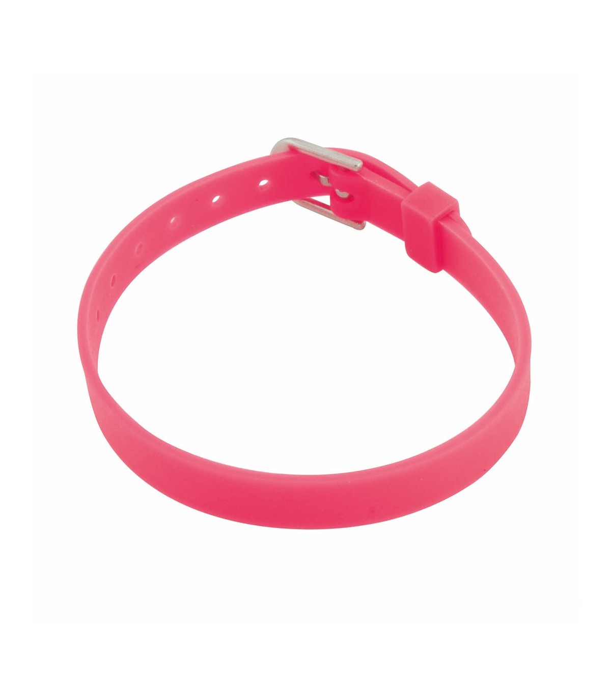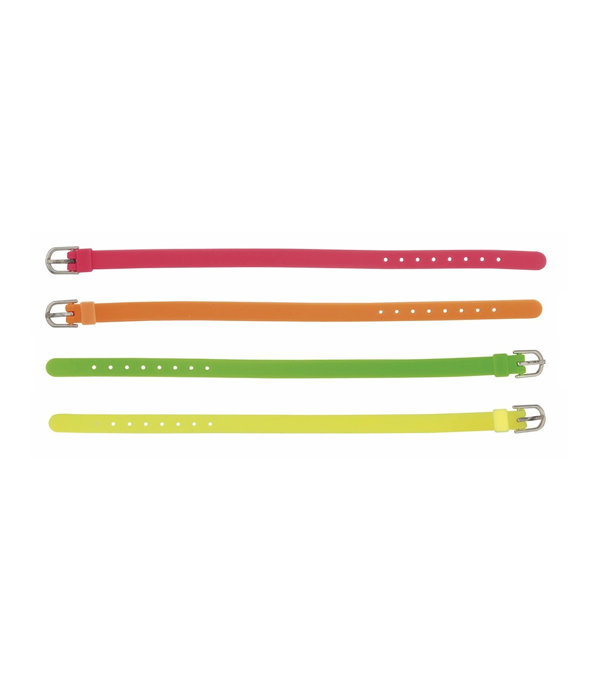 Pulsera de PVC en alegre acabado fluorescente. Con cierre ajustable de hebilla y en variada gama de colores.