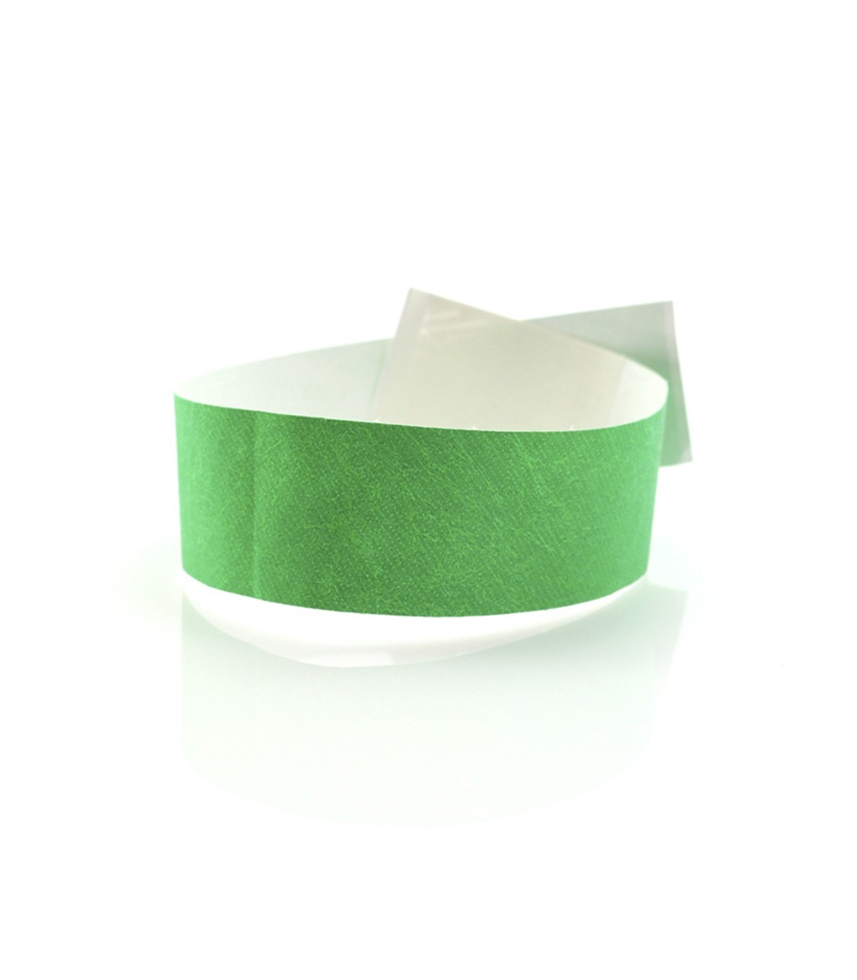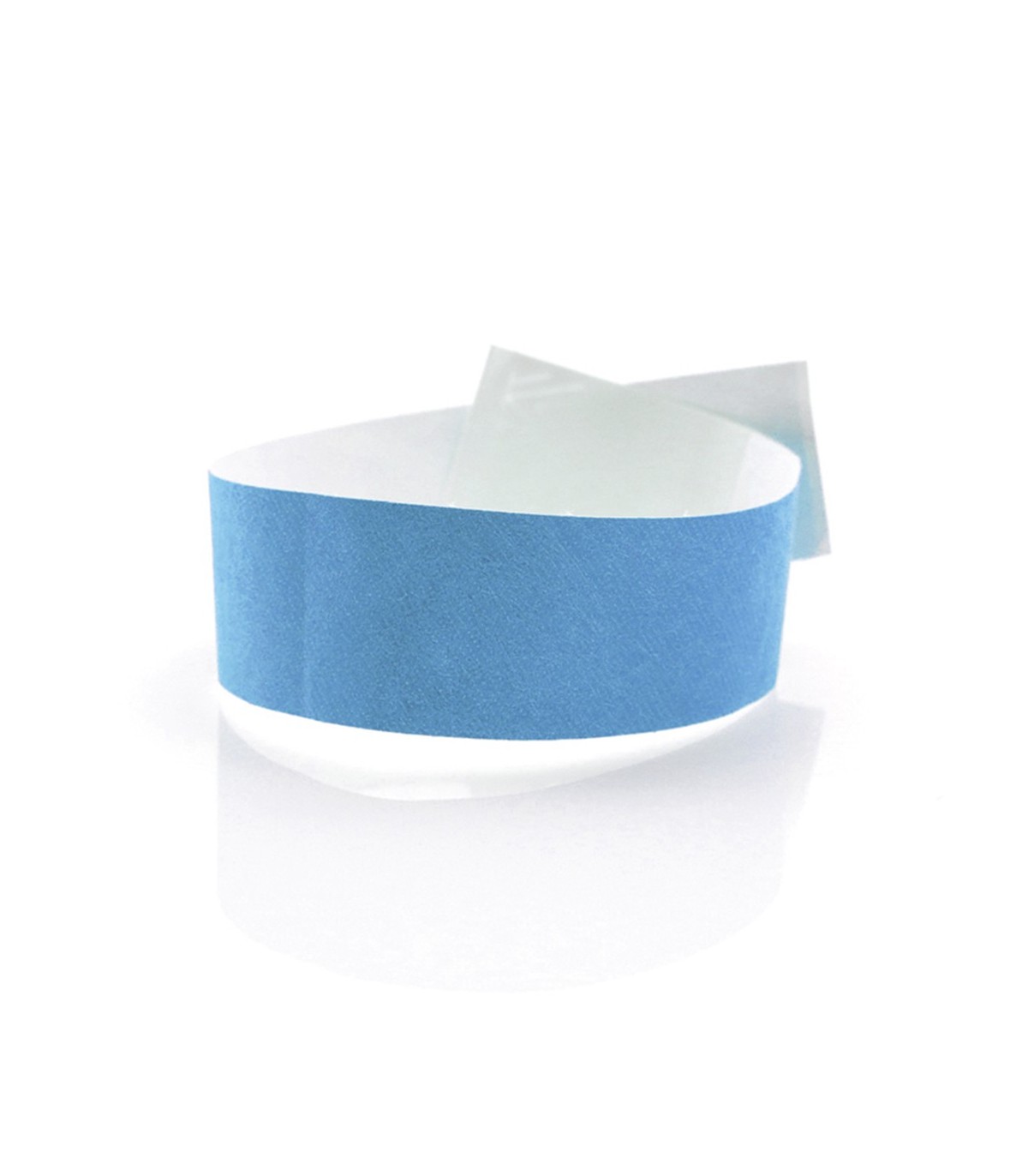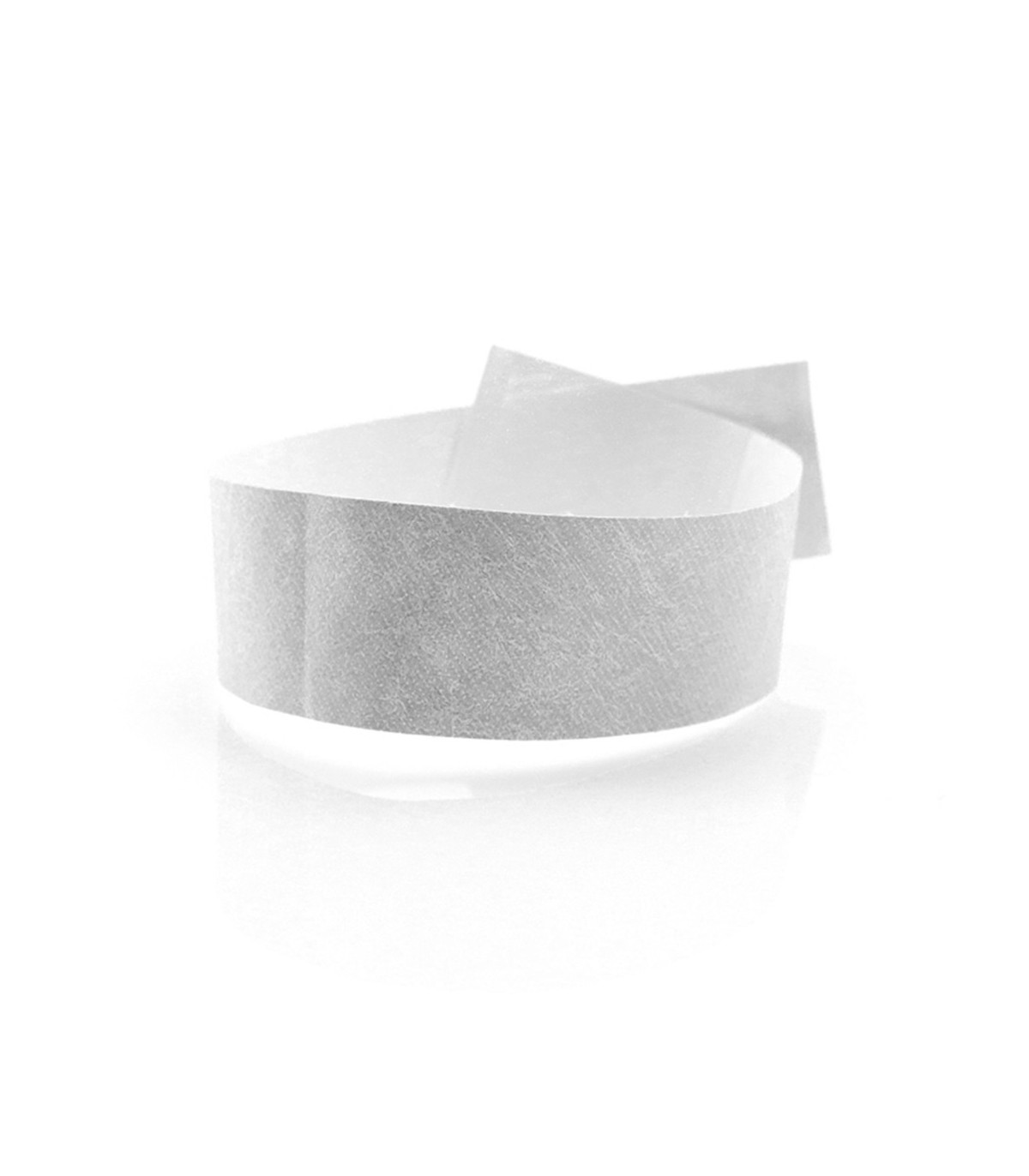 Pulsera para eventos en fibra sintética y variada gama de vivos colores. Con cierre adhesivo, resistente al agua y presentada en plancha troquelada de 10 piezas con numeración individual.