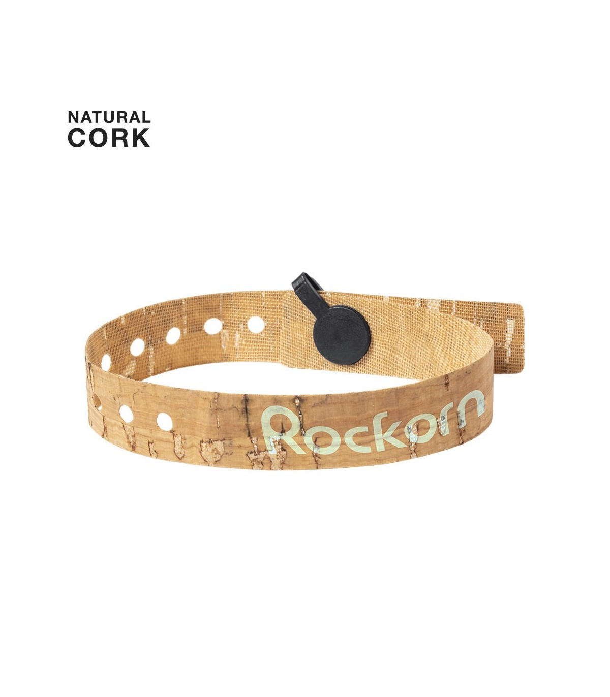 Pulsera para eventos de fabricación ecológica. elaborada en 100% corcho, para así fomentar el uso de materiales naturales y contribuir a la sostenibilidad del planeta. Resistente al agua, ajustable y con cierre de seguridad.