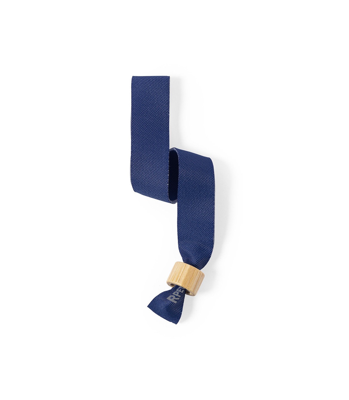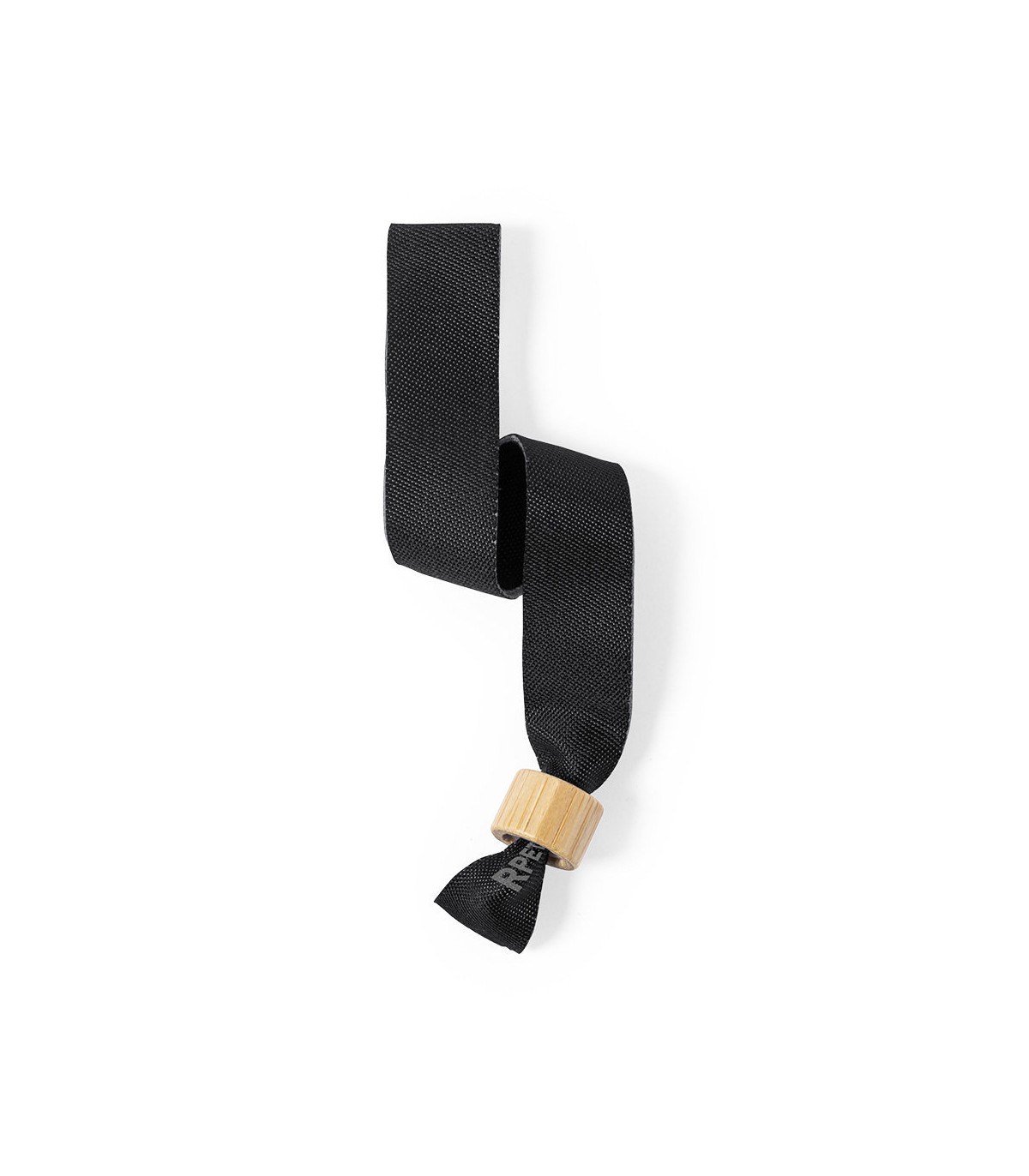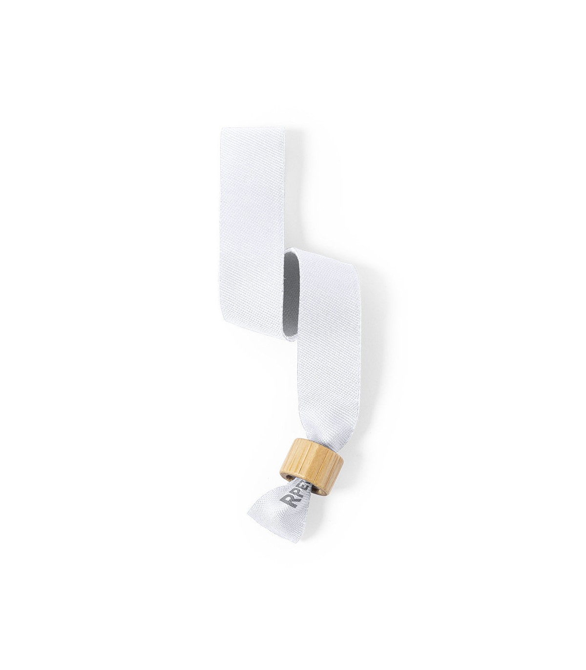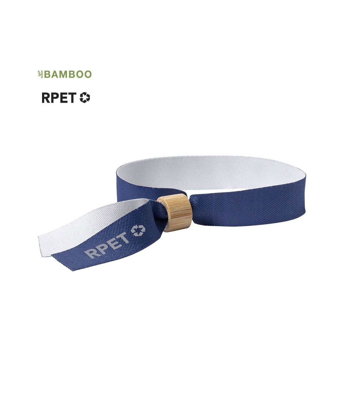 Pulsera para eventos de fabricación ecológica. elaborada en poliéster RPET de 160g/m2, elaborado a partir de plástico reciclado para así fomentar la reutilización de residuos plásticos y contribuir a la sostenibilidad del planeta. Con ajustador en bambú y disponible en variada gama de colores, color blanco especialmente diseñado para sublimación. Distintivo RPET impreso en la pulsera.