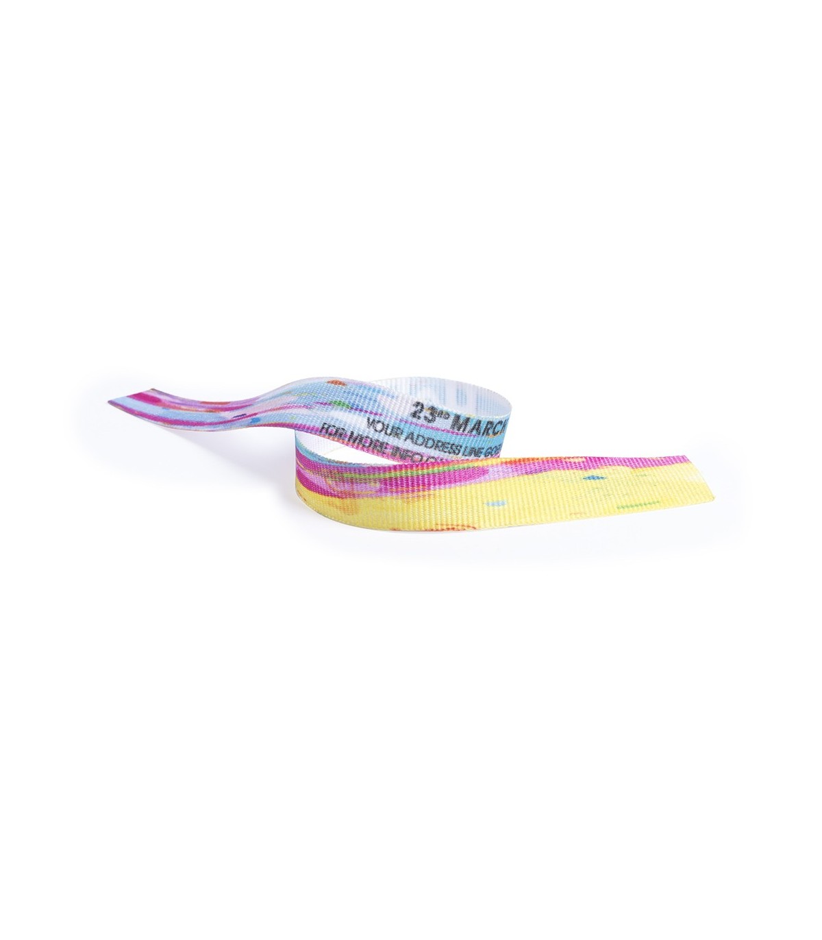 Pulsera en resistente y suave poliéster, especialmente diseñada para personalización total en sublimación para pedidos a partir de 250 piezas.