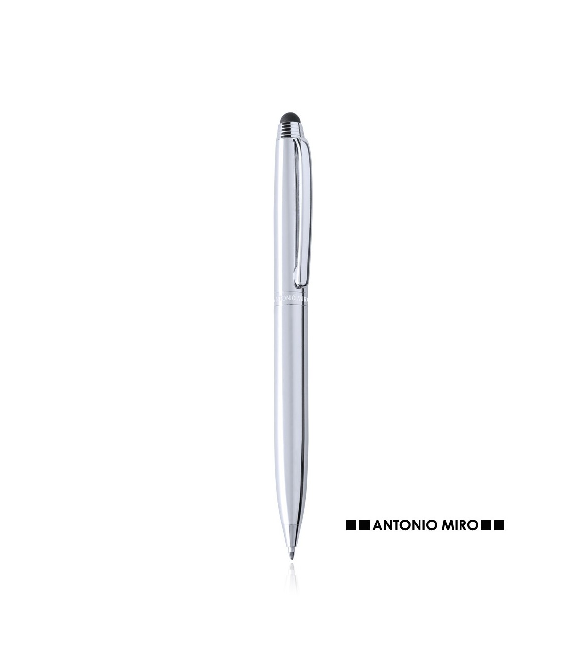 Bolígrafo puntero de Antonio Miró de mecanismo giratorio con suave cuerpo metálico, de elegante color plateado. Clip de diseño a juego. Presentado en estuche individual negro con logotipo de la marca. Tinta azul.