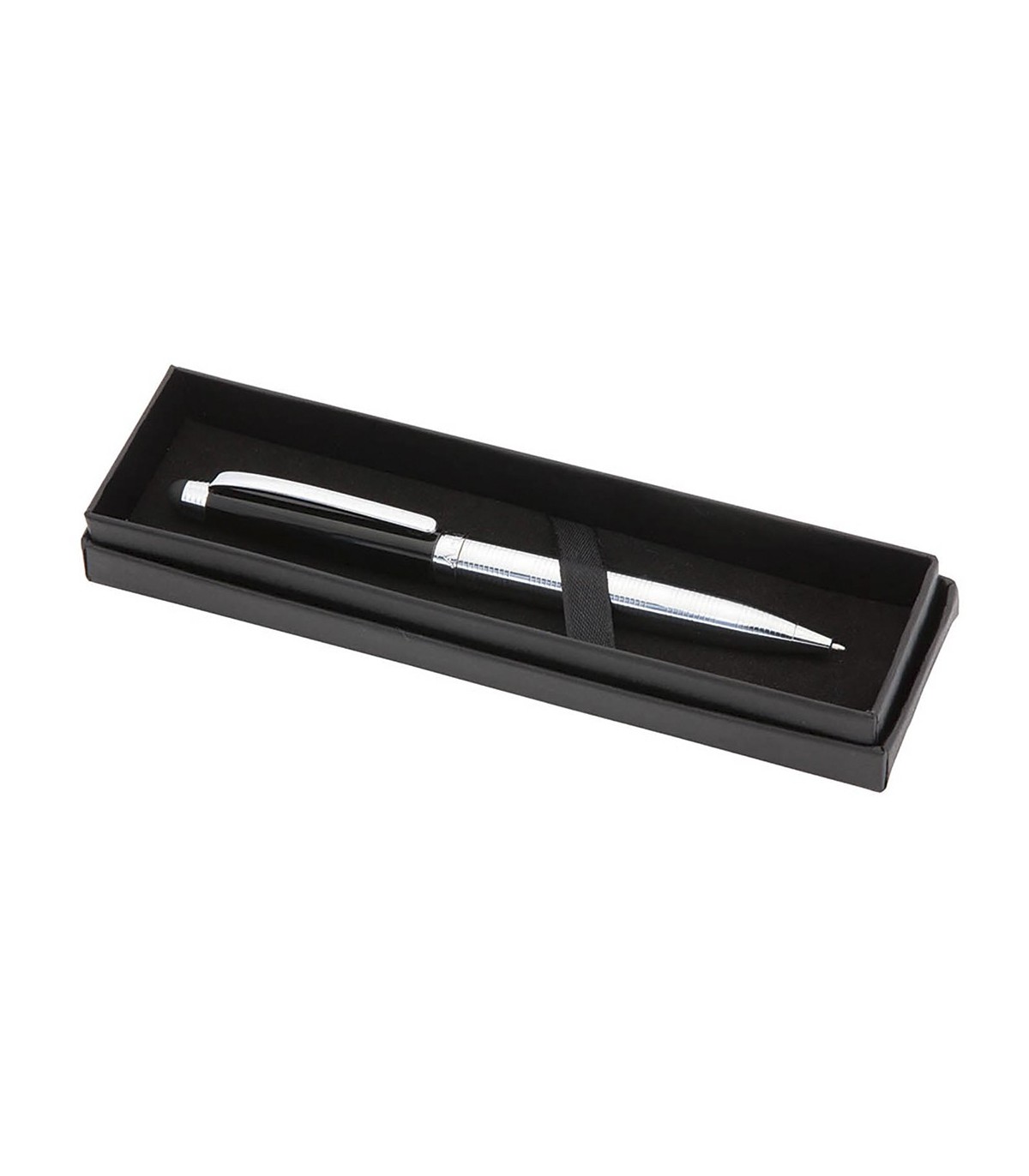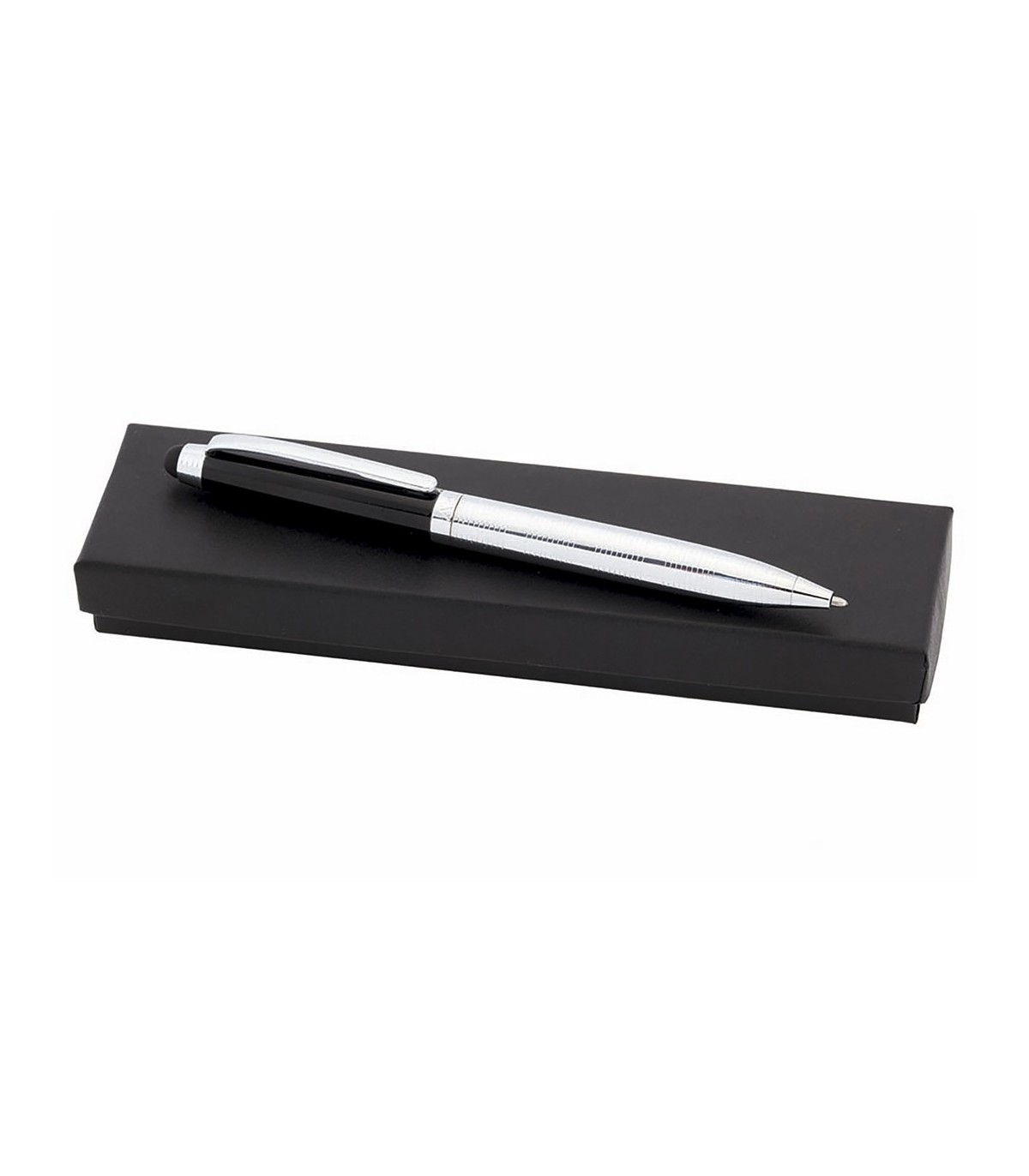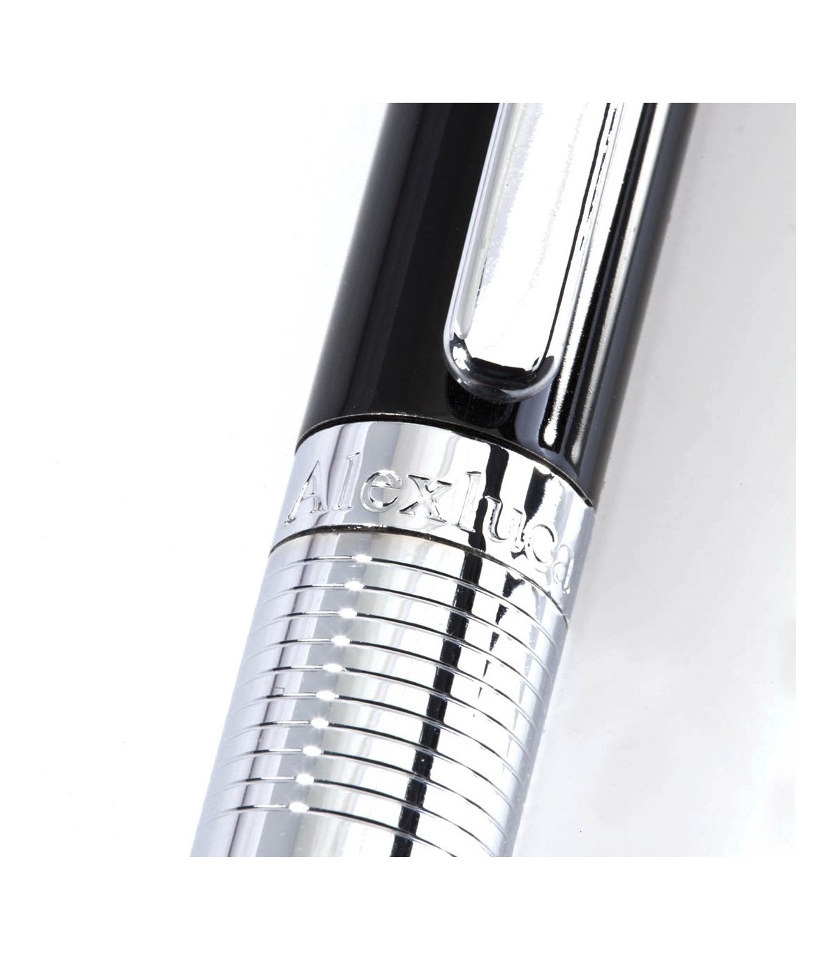 Bolígrafo puntero de Alexluca de mecanismo giratorio con suave cuerpo metálico, de elegante combinación de colores en plateado y negro. Clip y empuñadura de diseño a juego. Presentado en estuche individual negro con logotipo de la marca. Tinta azul.