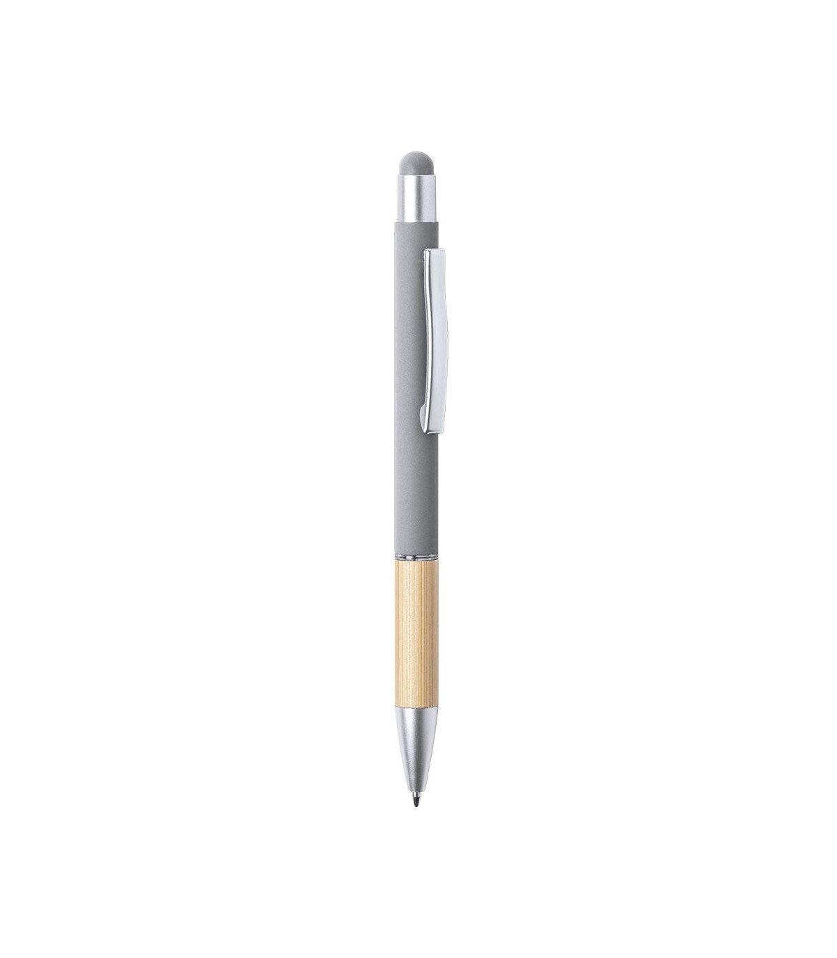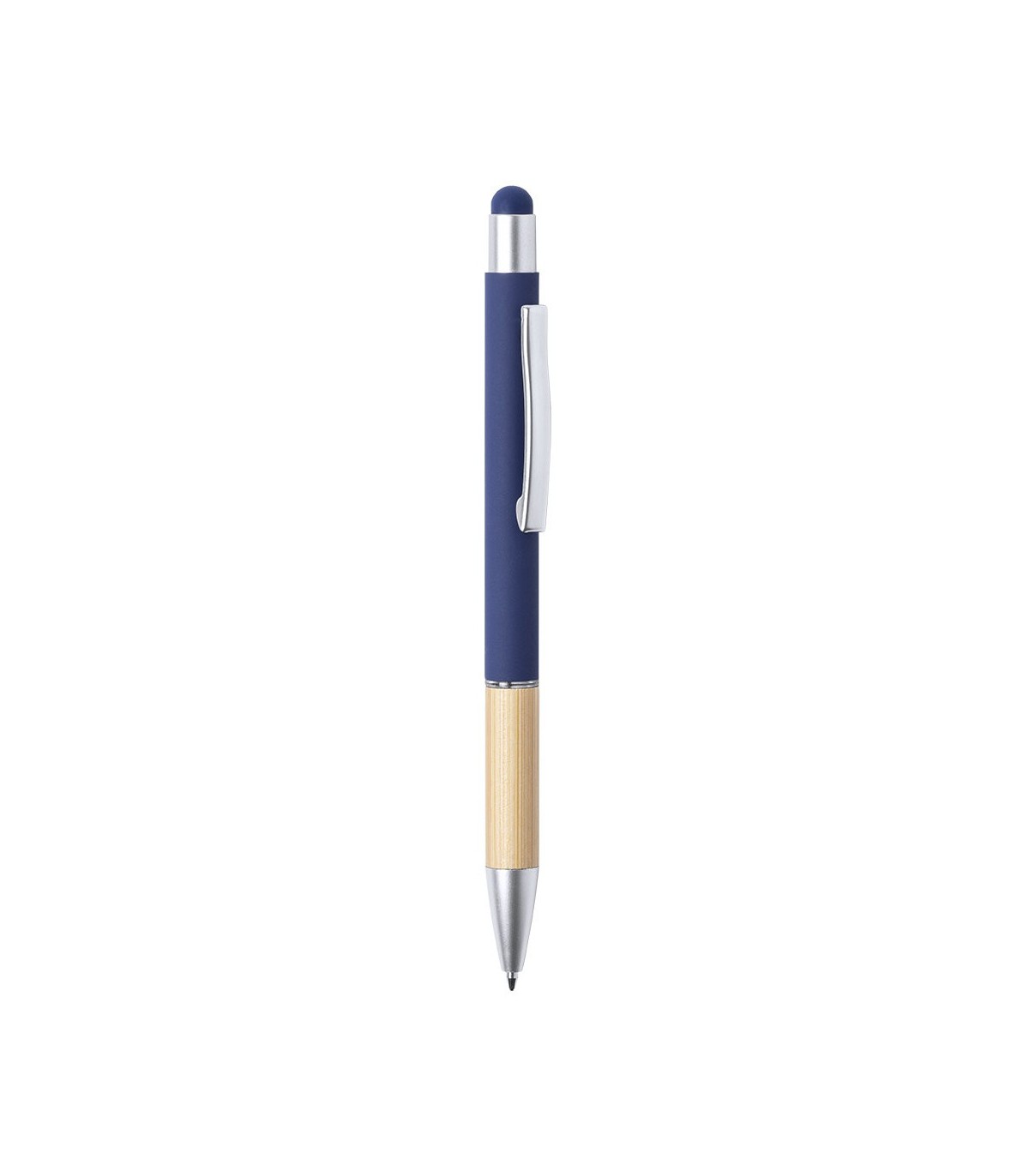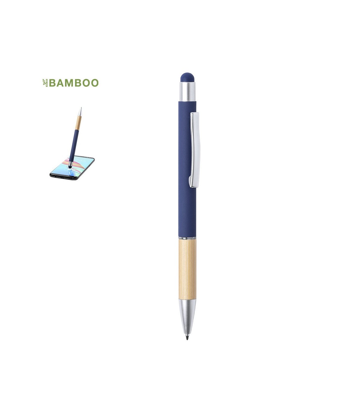 Puntero con mecanismo de empuje y línea natural. Diseño elegante, con cuerpo de aluminio mate y mango de bambú combinado con accesorios mate. Clip de metal y anillo transparente, tinta azul. Disponible en una variedad de colores.