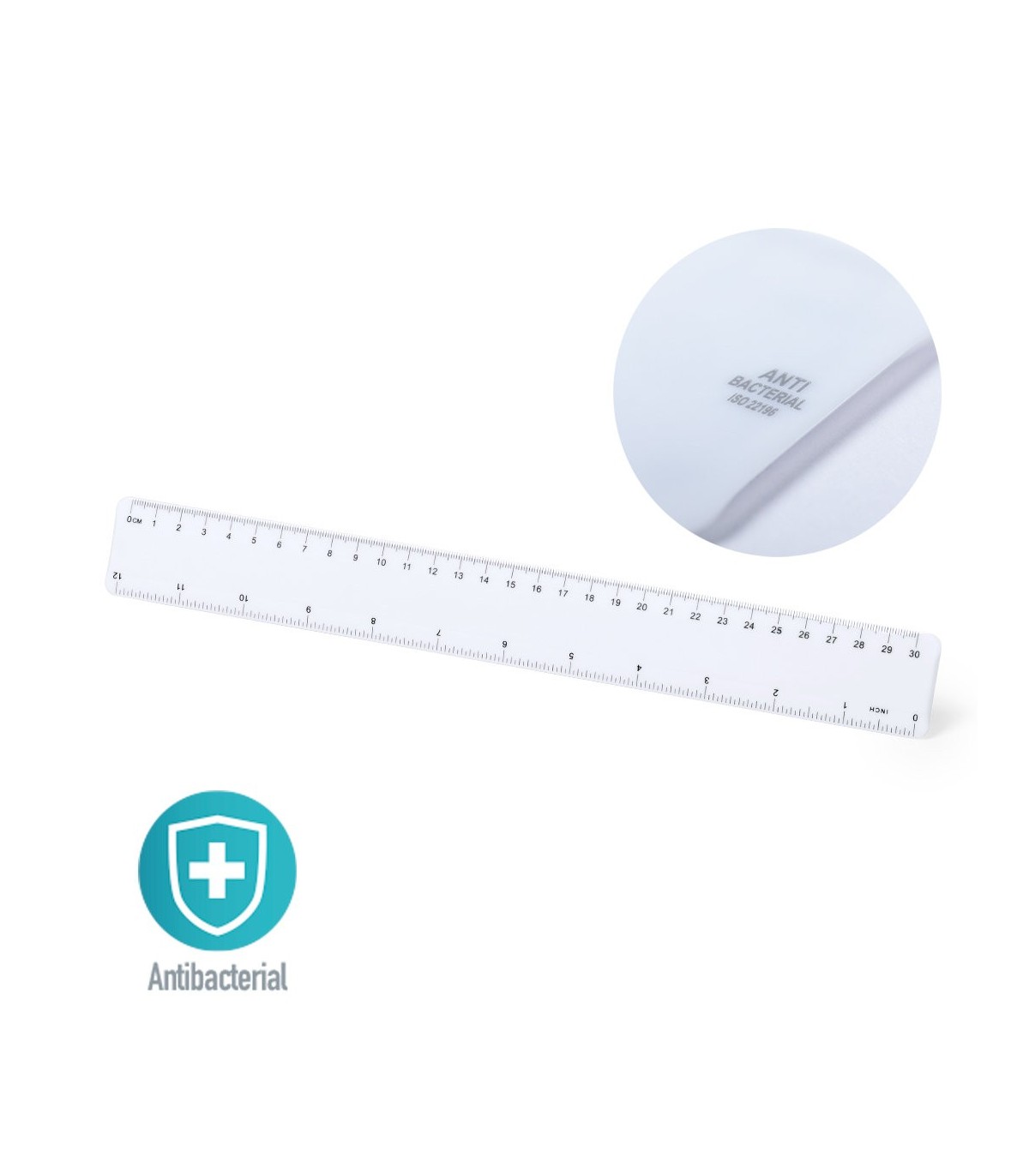 Regla antibacteriana de 30cm con cuerpo en acabado sólido. Sistema métrico en centímetros y pulgadas. Presentada en bolsa individual. Los productos con tratamientos antibacterianos son capaces de reducir drásticamente las cargas bacterianas presentes en las superficies de los materiales, gracias a la incorporación de agentes microbianos permanentes estáticos, con alta efectividad para inhibir y prevenir la contaminación bacteriana. Artículo de acuerdo al estándar ISO 22196, que determina la actividad antibacteriana en materiales plásticos y superficies no porosas, lo que permite conocer la efectividad de inhibición microbiana que tienen los aditivos sobre los objetos tratados mediante una evaluación cuantitativa.
