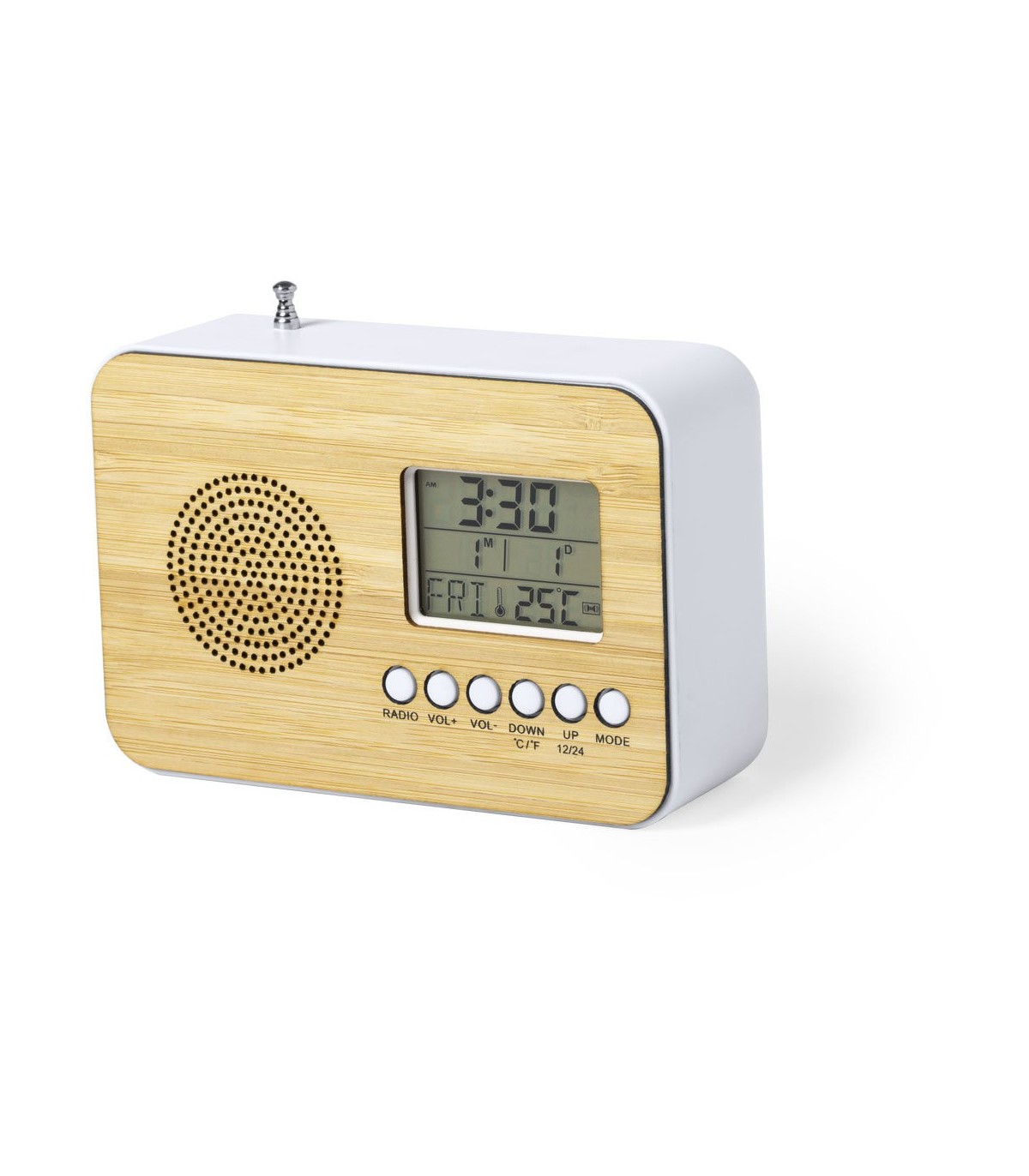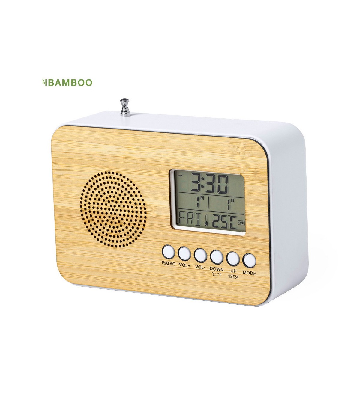 Reloj radio de línea ecológica con frontal en bambú. Funciones alarma, calendario, termómetro y radio FM, con antena retráctil. Alimentación a pilas (2xAAA no incluidas) y presentado en atractiva caja de diseño eco.