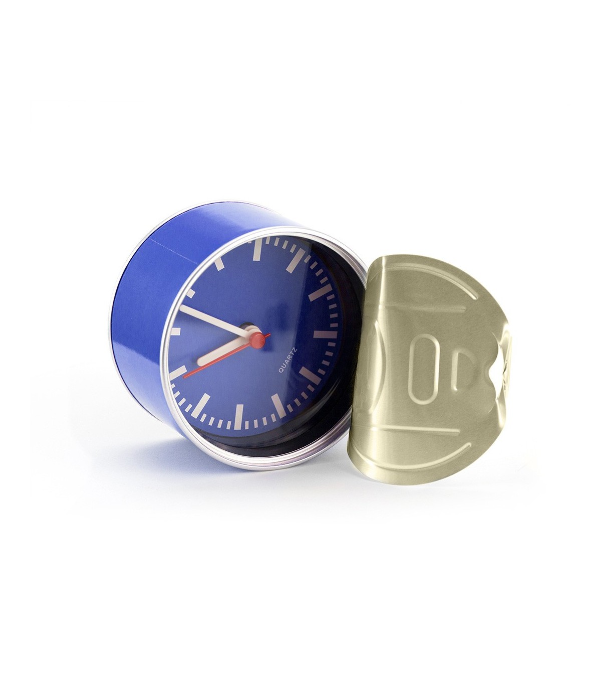 Original reloj analógico de diseño de lata con cuerpo en suave acabado de aluminio brillante. Con orificio para colgar en pared, soporte de sobremesa e imanes. Alimentación a pila: tipo AA no incluida y Embalaje en empaque individual.