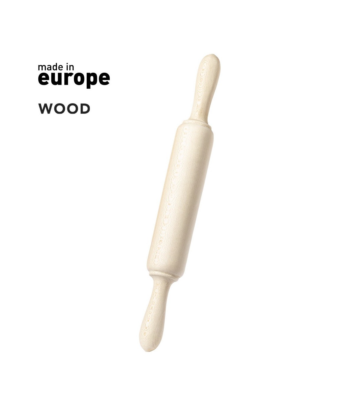 Rodillos de cocina personalizados, y de fabricación europea y hecho en madera natural, con cómodos mangos en los extremos. Incluye certificación PEFC..