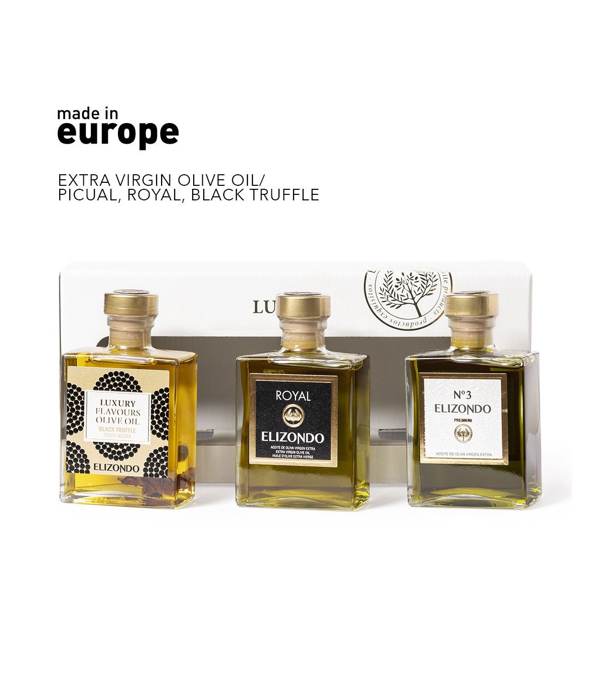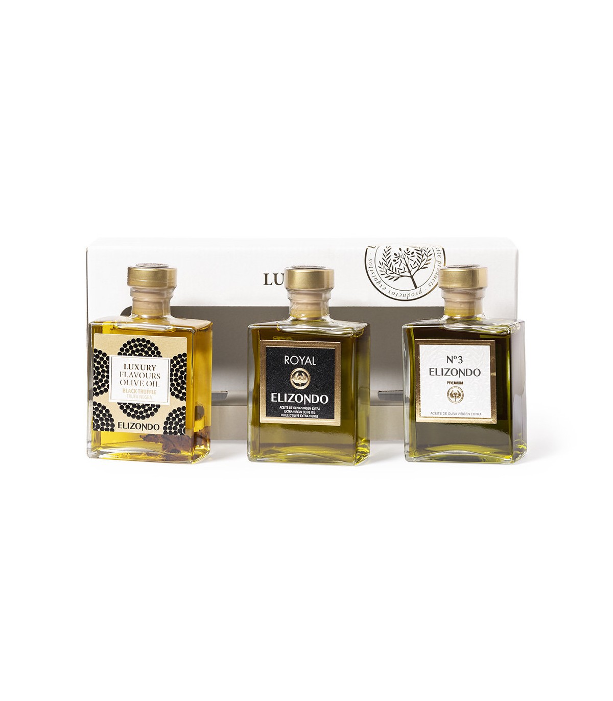 Set de aceites de oliva Elizondo Luxury. Incluye 3 botellas de cristal con aceites de 200ml: 1 botella Aceite Nº3 de 200 ml: Calidad Virgen Extra temprano y de variedad Picual, de un color verde intenso, recolectado en las primeras semanas de octubre, cuando las características organolépticas del fruto son óptimas, de extracción en frío 1 botella Aceite Premium Royal de 200 ml: Calidad Virgen Extra, de variedad autóctona y limitada con unas cualidades y peculiaridades que convierten a esta variedad de aceite en única en el mundo 1 botella Aceite Luxury Trufa Negra: Calidad Virgen Extra infusionado, con toda la exclusividad que representan las láminas de trufa negra natural que maceran en su interior. Trufa negra variedad de origen español, un producto fesco, sano y exclusvio, muy apreciado en gastronomía Fabricación española, set presentado en elegante estuche con ventana exclusivo y con amplia superficie de marcaje.