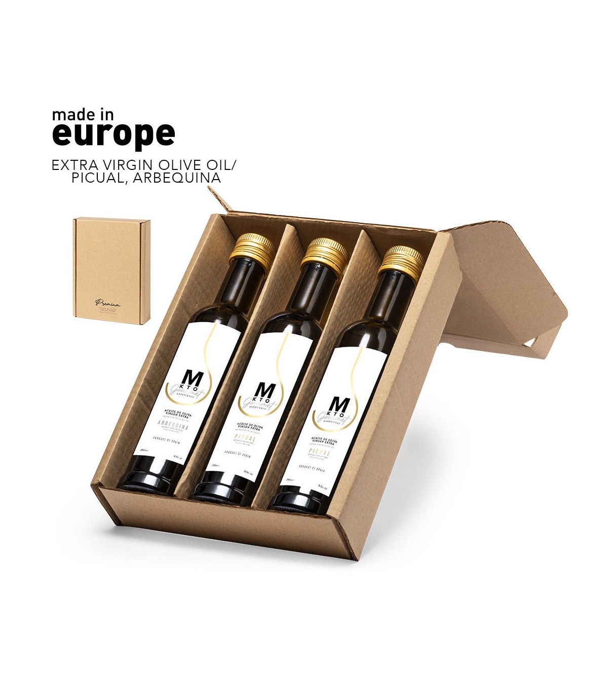 Set de aceite Premium Golden 3 botellas de cristal de 250 ml, de calidad Virgen Extra y en variedades 2xPicual y 1xArbequina. Aceites de gran intensidad, cuyo fruto se recolecta de forma temprana, garantizando así las mejores propiedades organolépticas, y extracción en frio. Fabricación española, presentado en un elegante estuche de cartón kraft, con amplia superficie de marcaje.