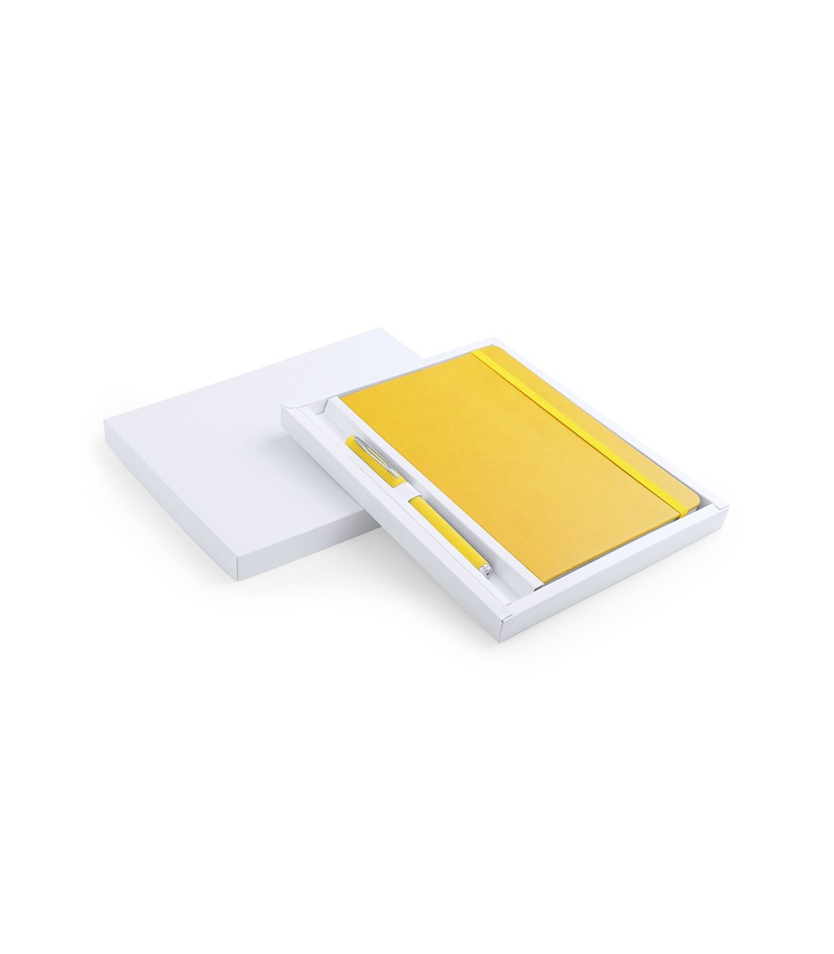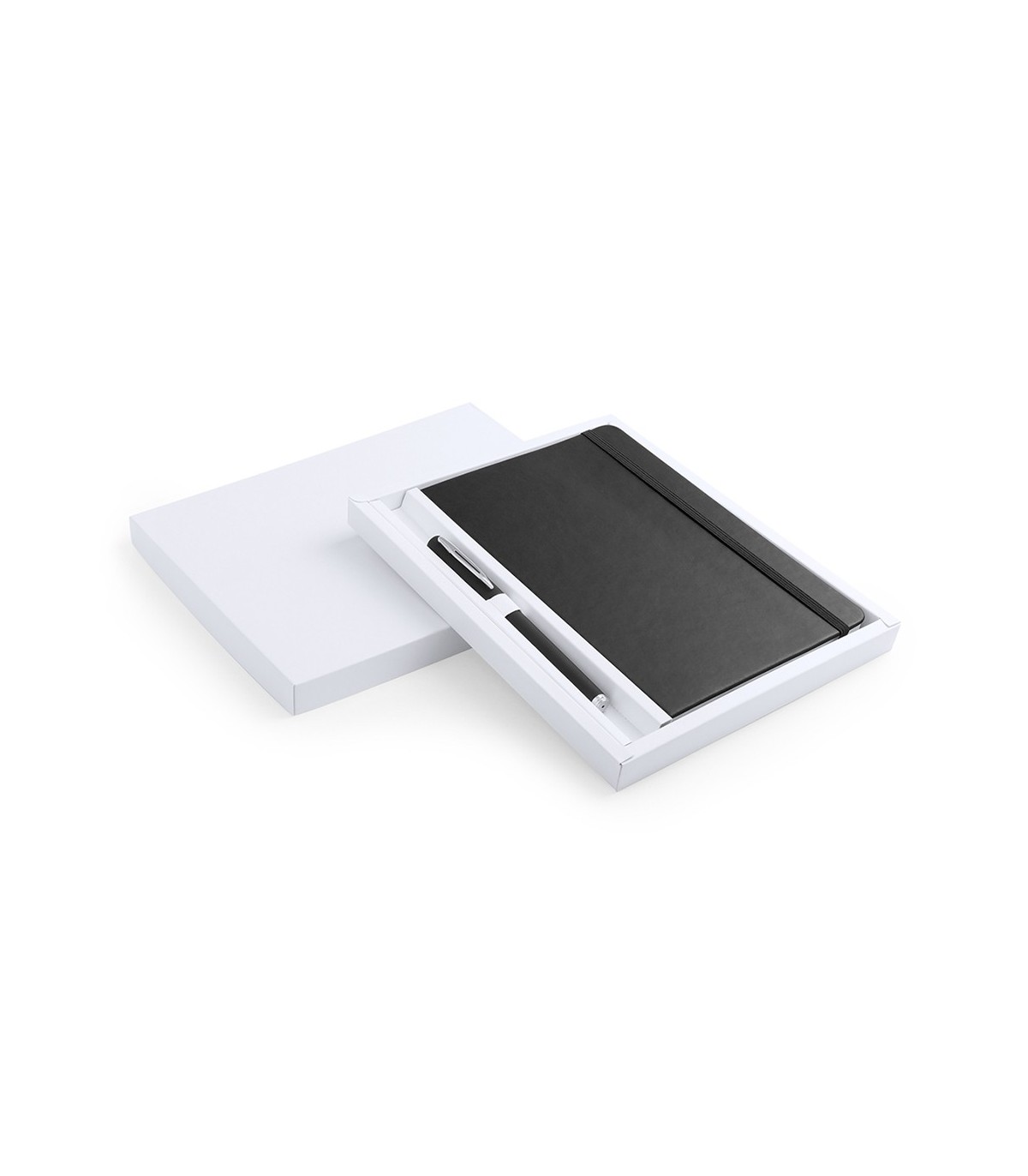 Set de bloc de notas con tapas de suave tacto acabadas en polipiel y bolígrafo de suave cuerpo a juego. De 100 hojas lisas con elástico de sujeción y marcapáginas de tela a juego. Presentado en elegante estuche de cartón blanco troquelado. Bolígrafo en tinta azul.