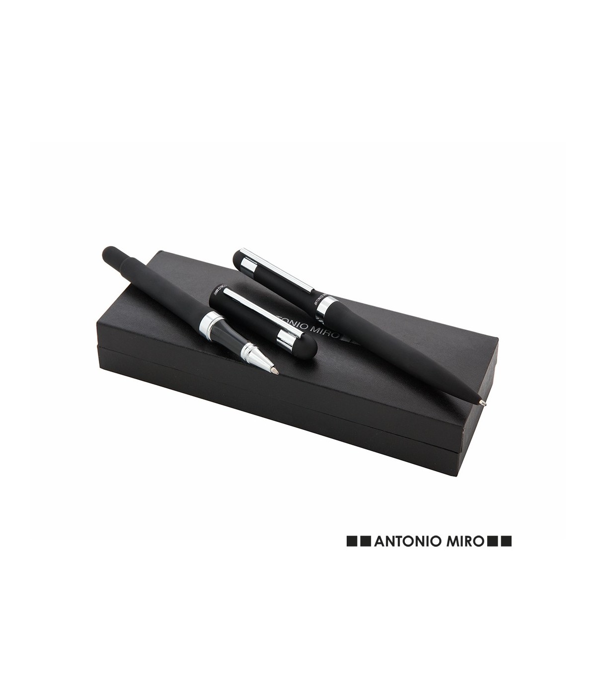 Elegante set de Antonio Miró con bolígrafo de mecanismo giratorio y roller de capucha y original anilla en sobrio diseño. De cuerpo metálico en acabado negro brillante con clip plateado. Presentado en elegante estuche individual en color negro con logotipo de la marca y funda. En tinta azul.