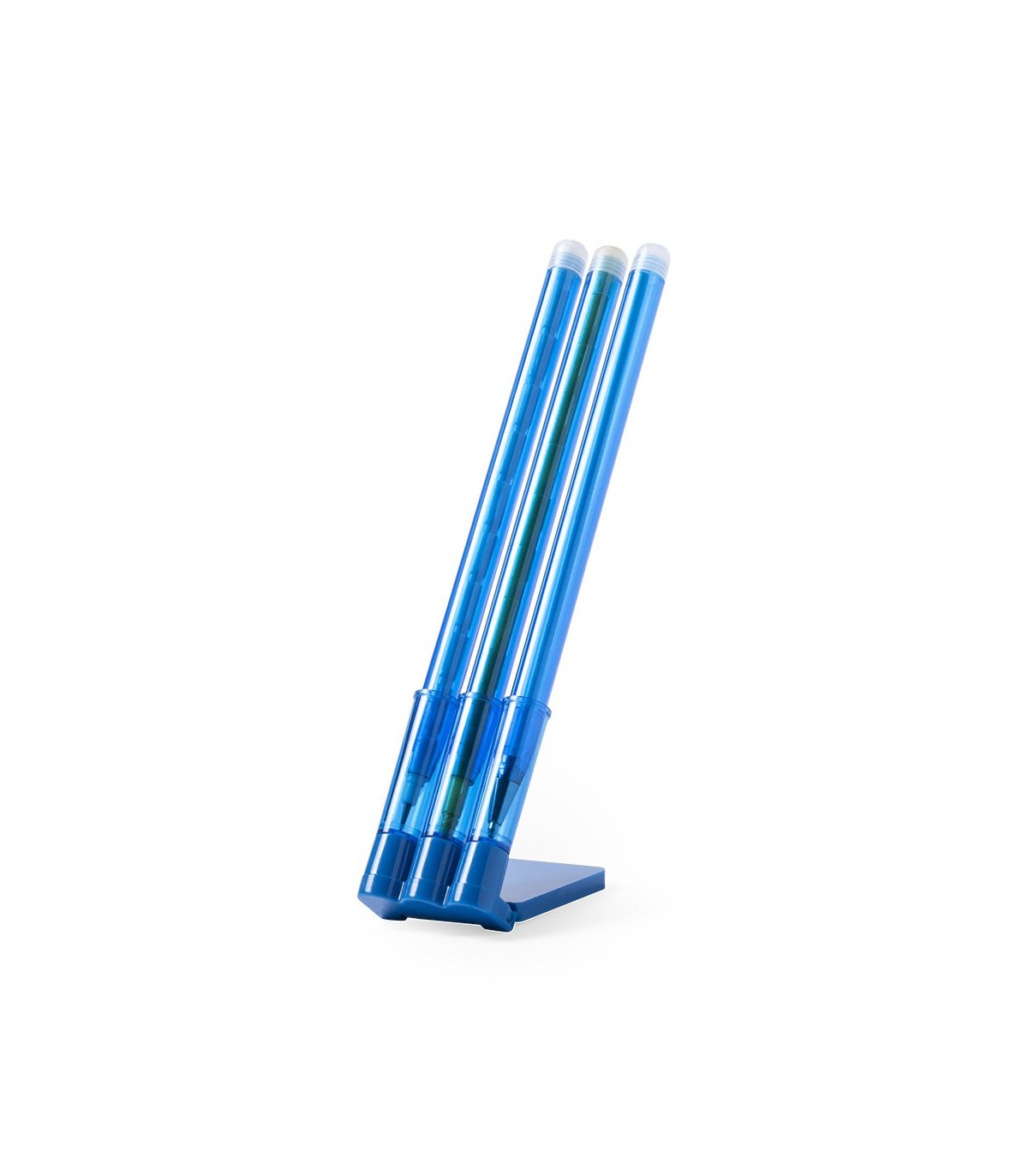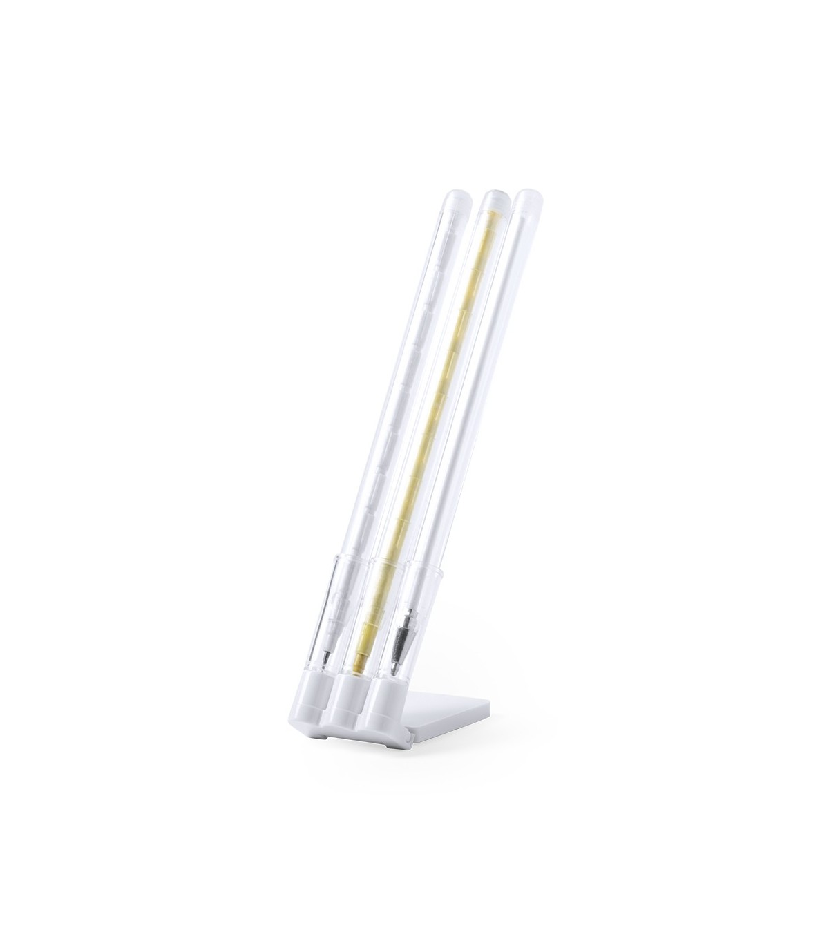 Original set de bolígrafo, marcador y lápiz con puntas intercambiables. De cuerpo en suave acabado de llamativos colores translúcidos y presentado en funda soporte individual a juego. Bolígrafo de tinta azul, marcador fluorescente amarillo y lápiz de mina negra.