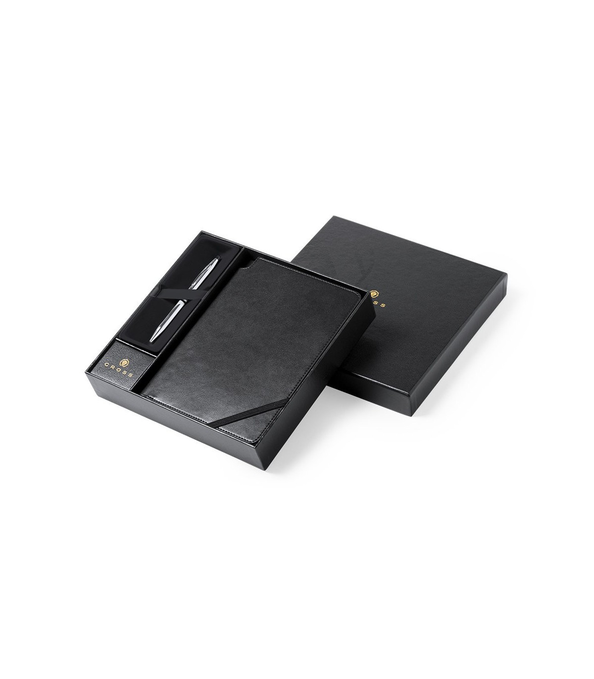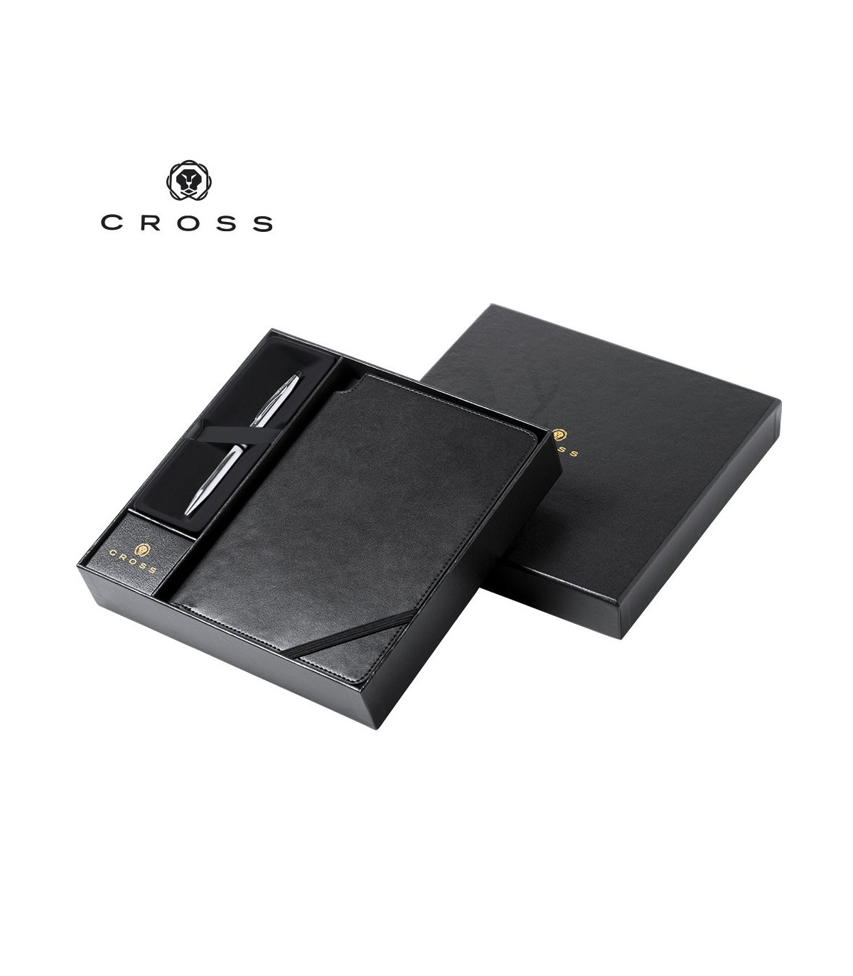 Set Century de Cross con bolígrafo y bloc de notas. Bolígrafo de mecanismo giratorio de tinta negra y cuerpo metálico de elegante terminación en plateado brillante. Bloc de notas con tapas de polipiel en acabado liso de color negro y 80 hojas con distribución a una raya. Presentado en estuche individual con logotipo de la marca.